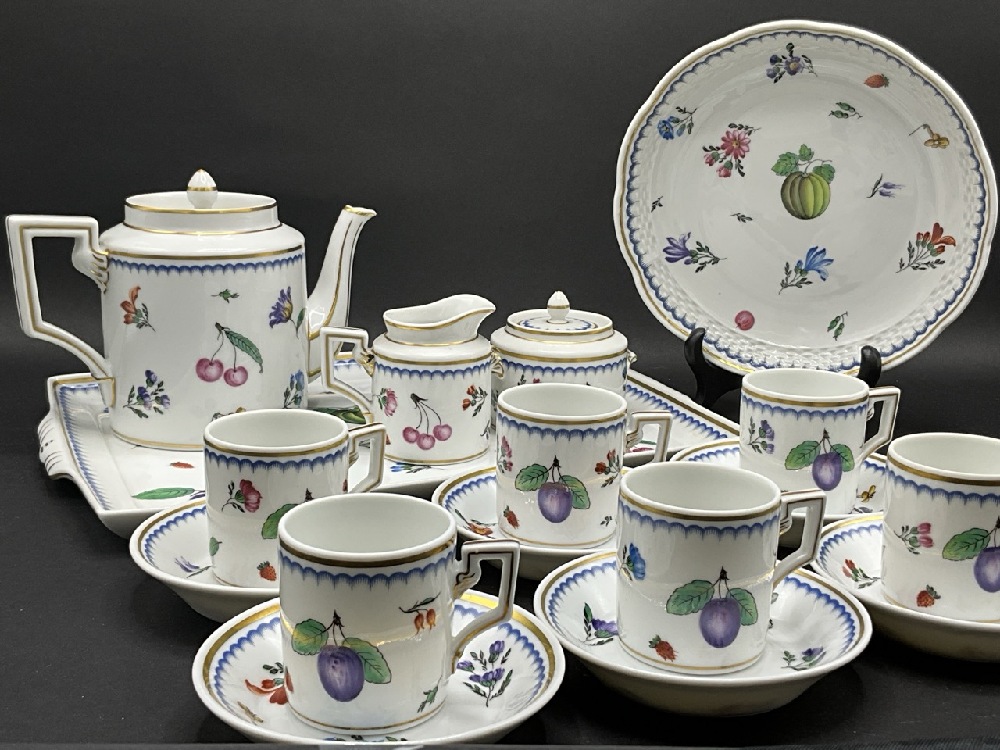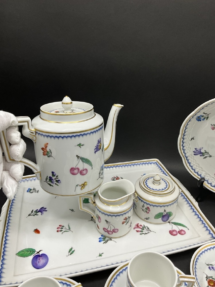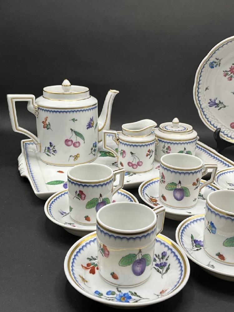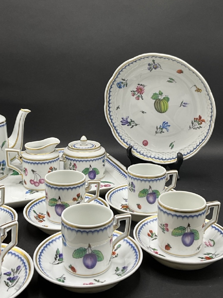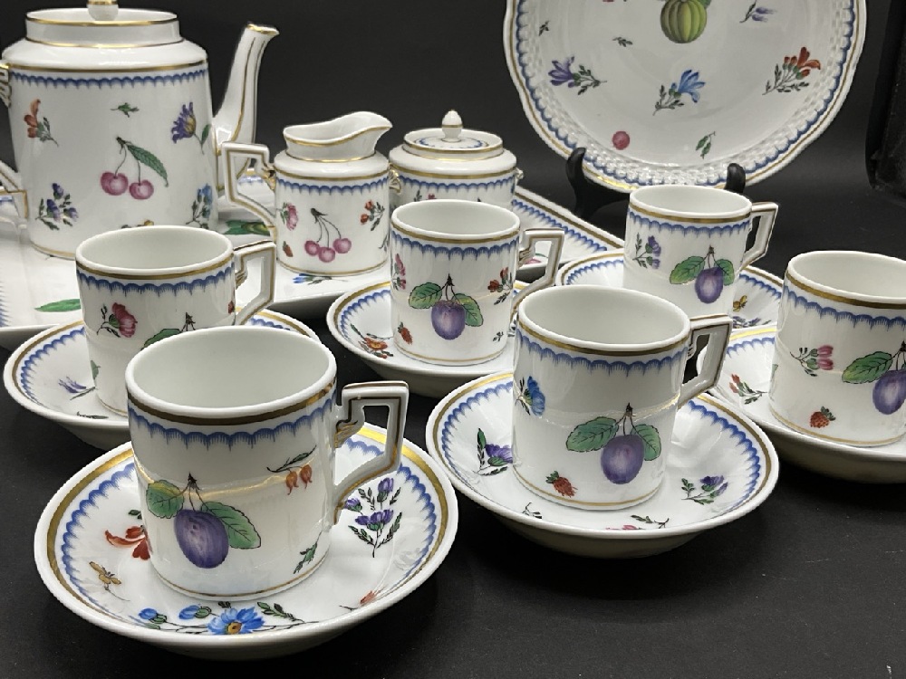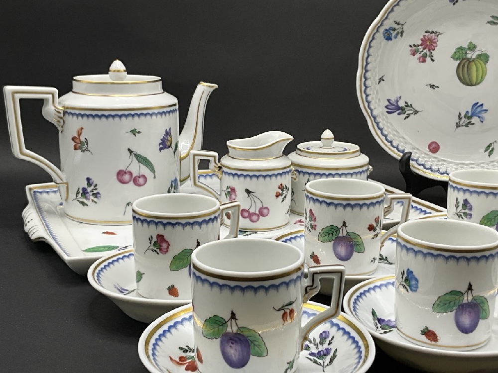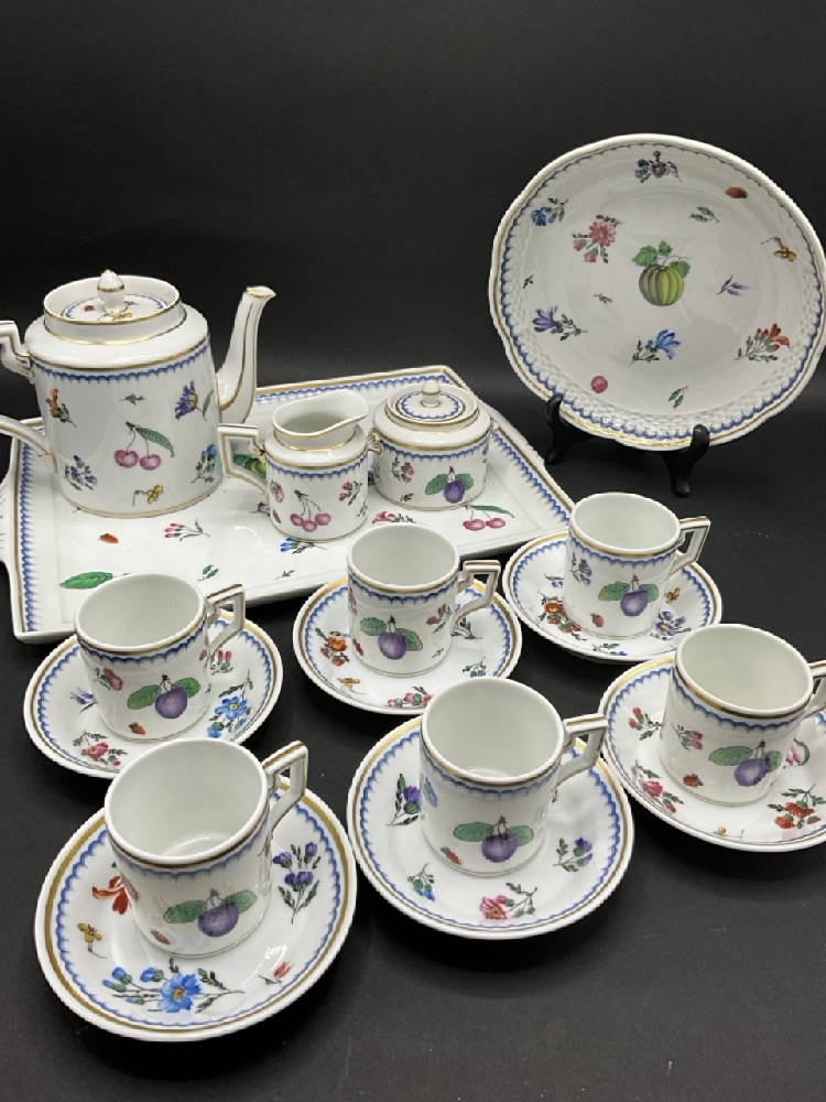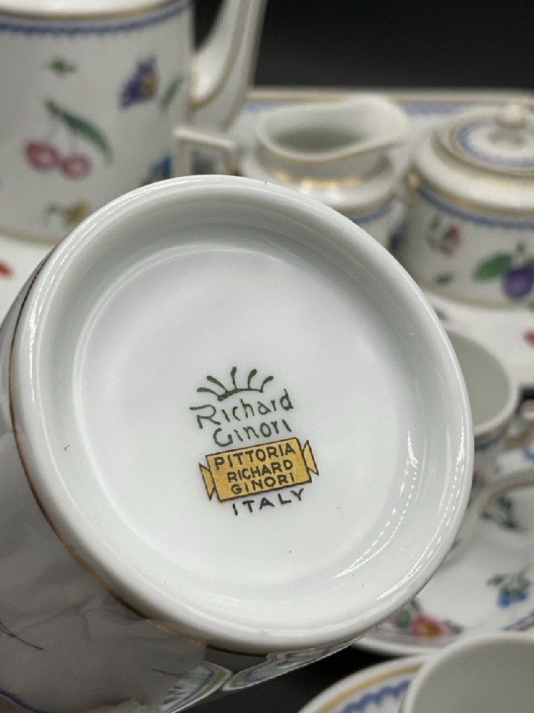 Pictoria by Richard Ginori Demitasse Porcelain Service. A fine Italian china service including serving tray, coffee pot, plate and six cups and saucers.
