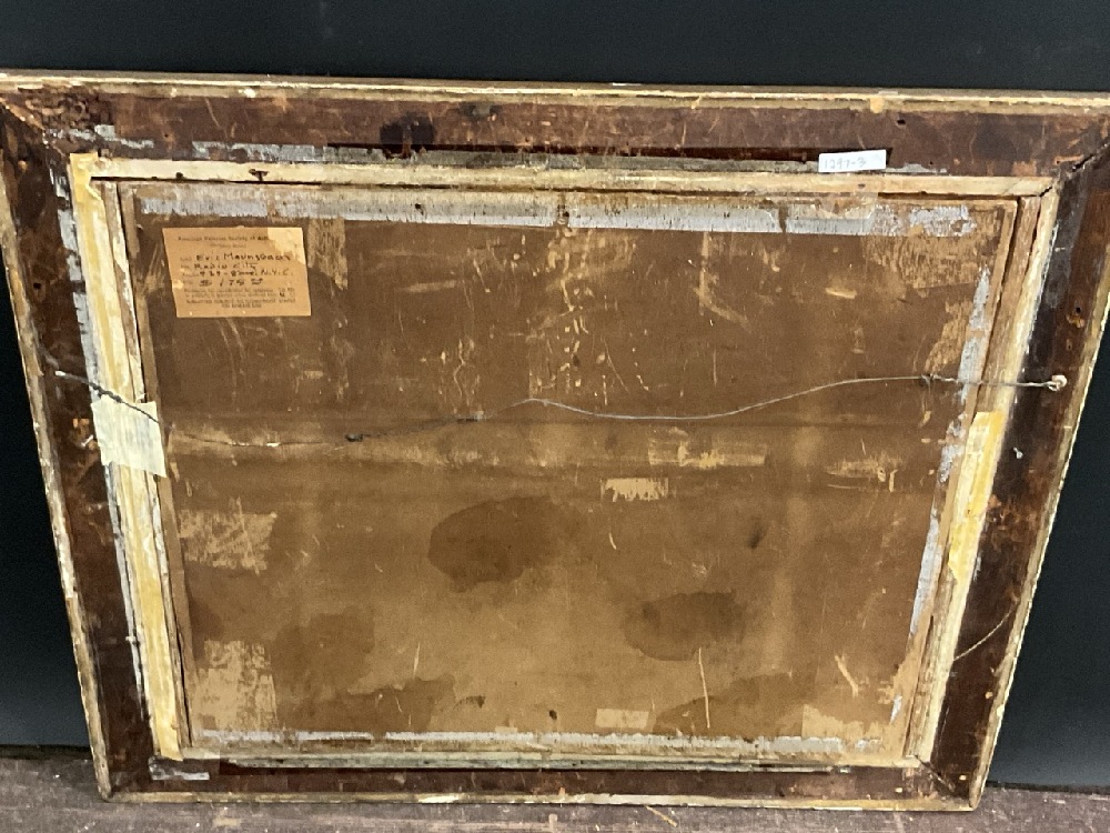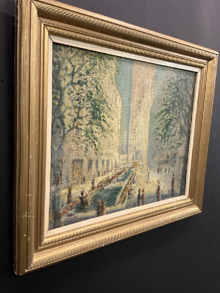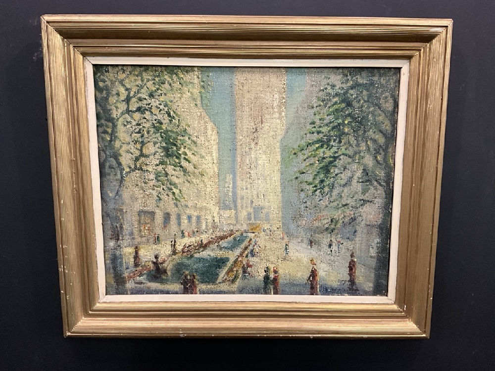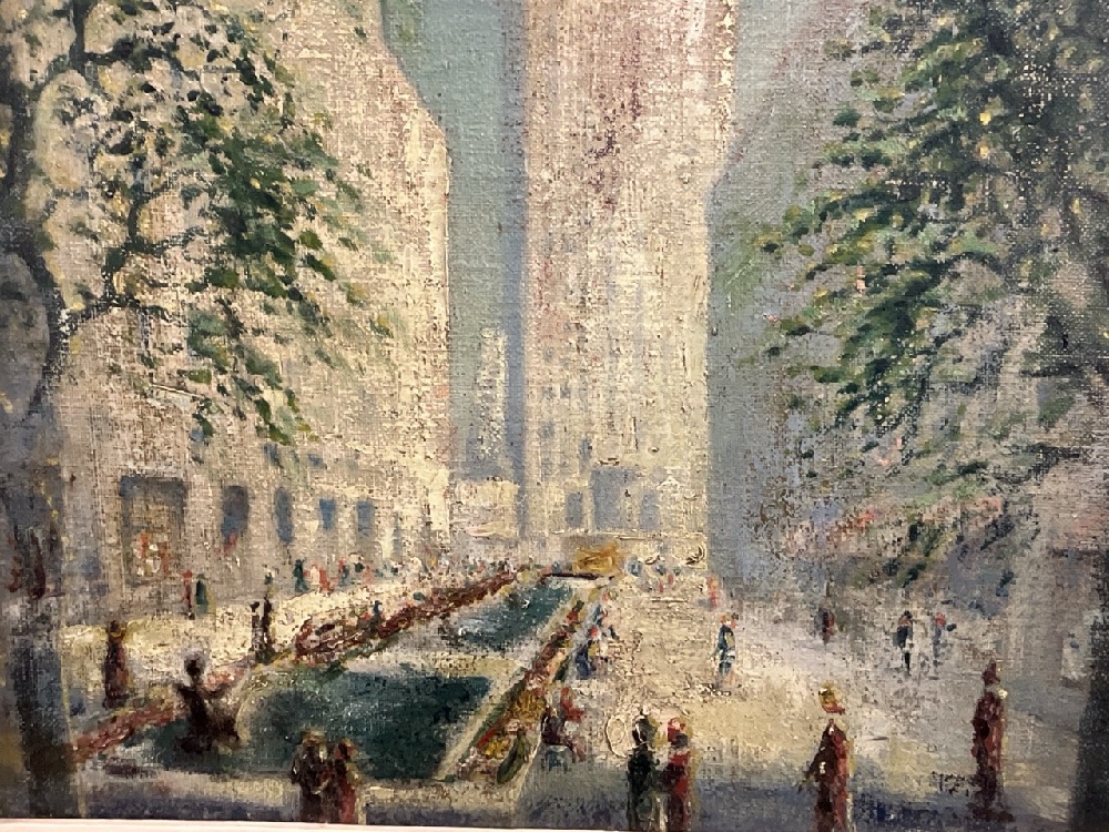Eric Maunsbach (1890-1969)Radio City and Rockefeller Center Winter Scene in New York City Oil painting on board. Dimensions: 18 1/2" X 23 1/2" Signed verso.
