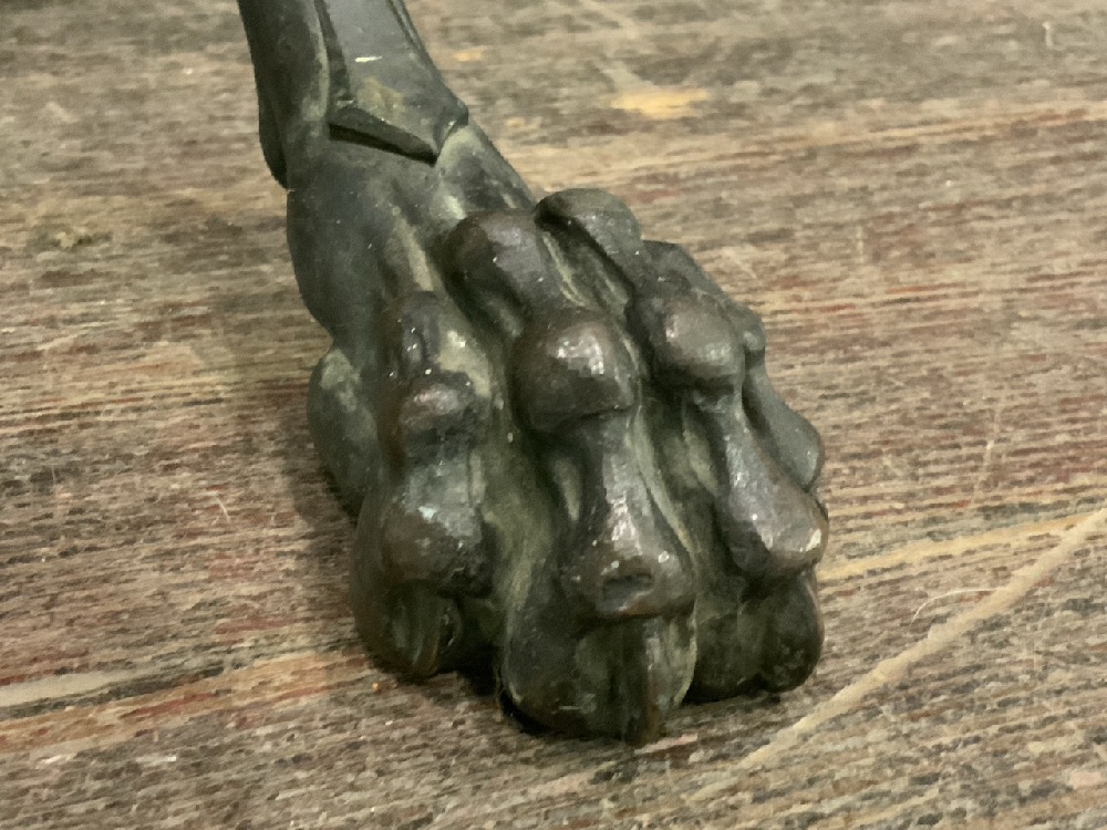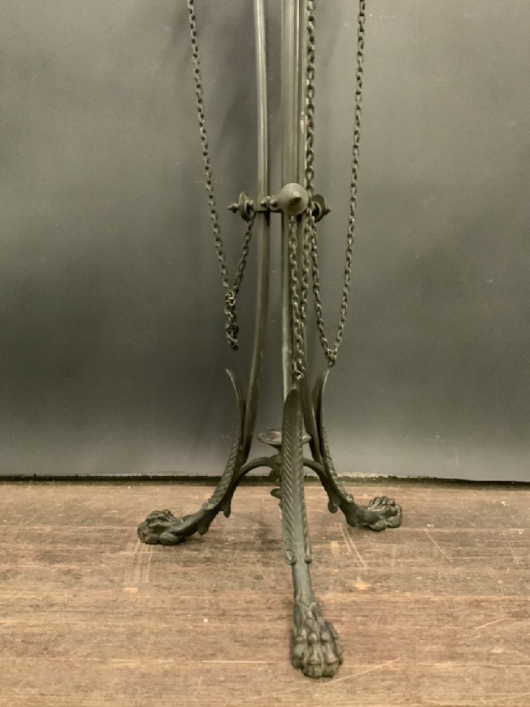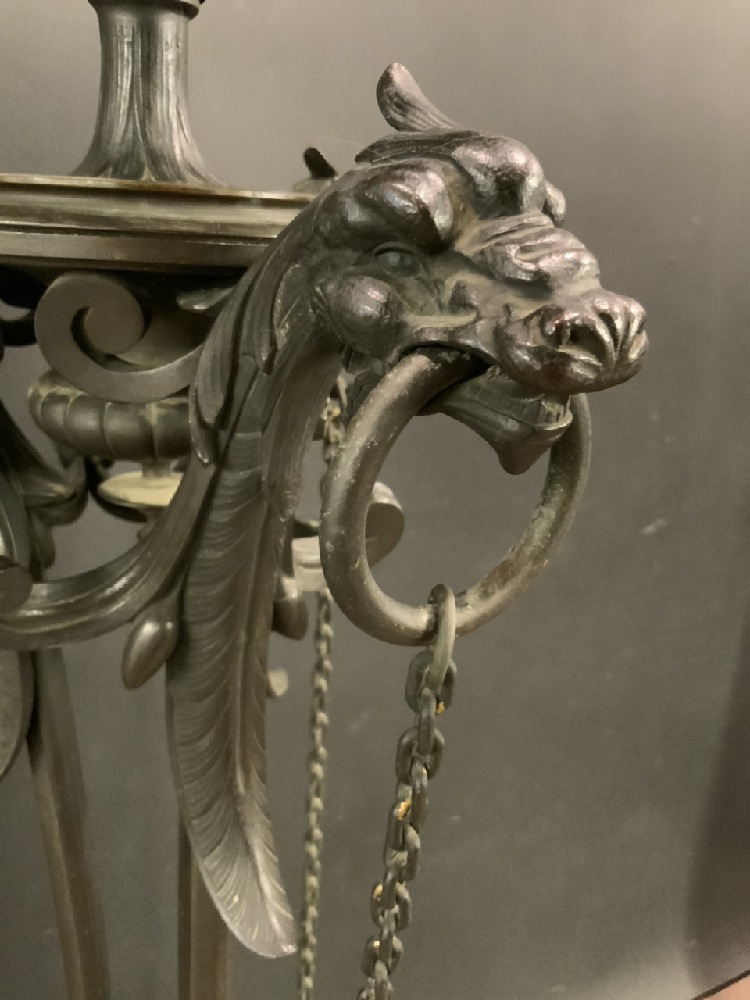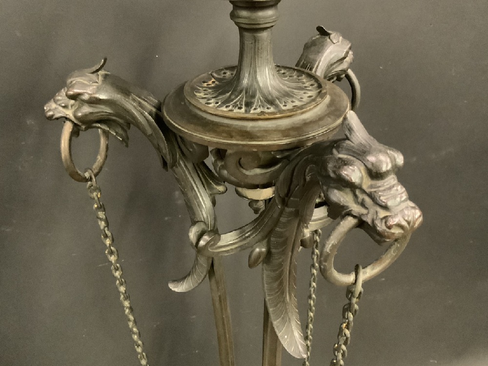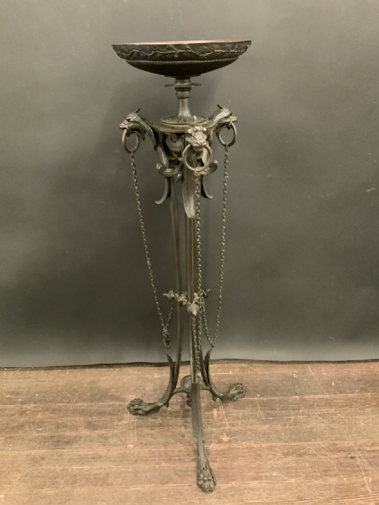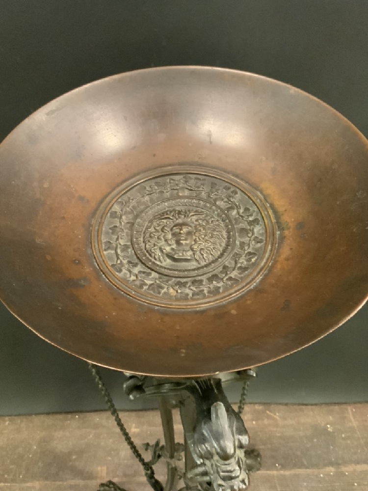 19th Century Bronze Pedestal Tripod Stand. Highly ornate with dragons, paw feet and foliage. Center of bronze basin decorated with high relief medallion size head of Medusa.