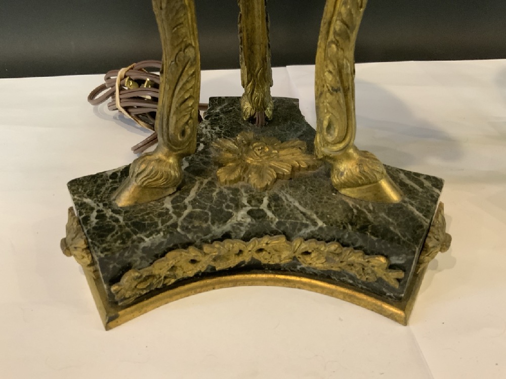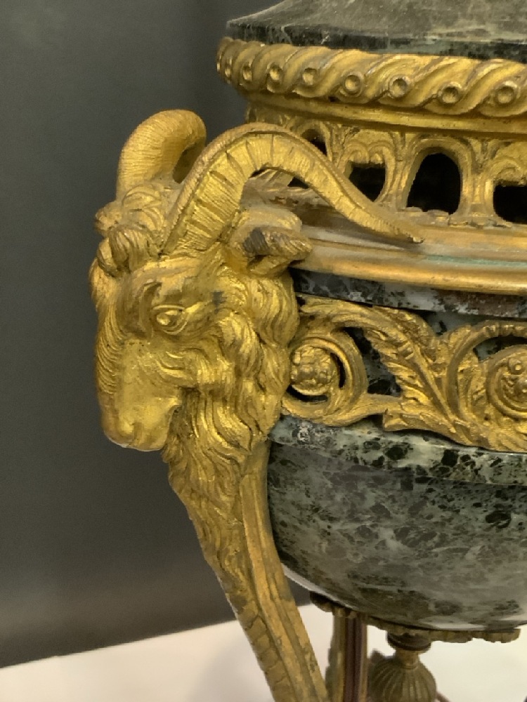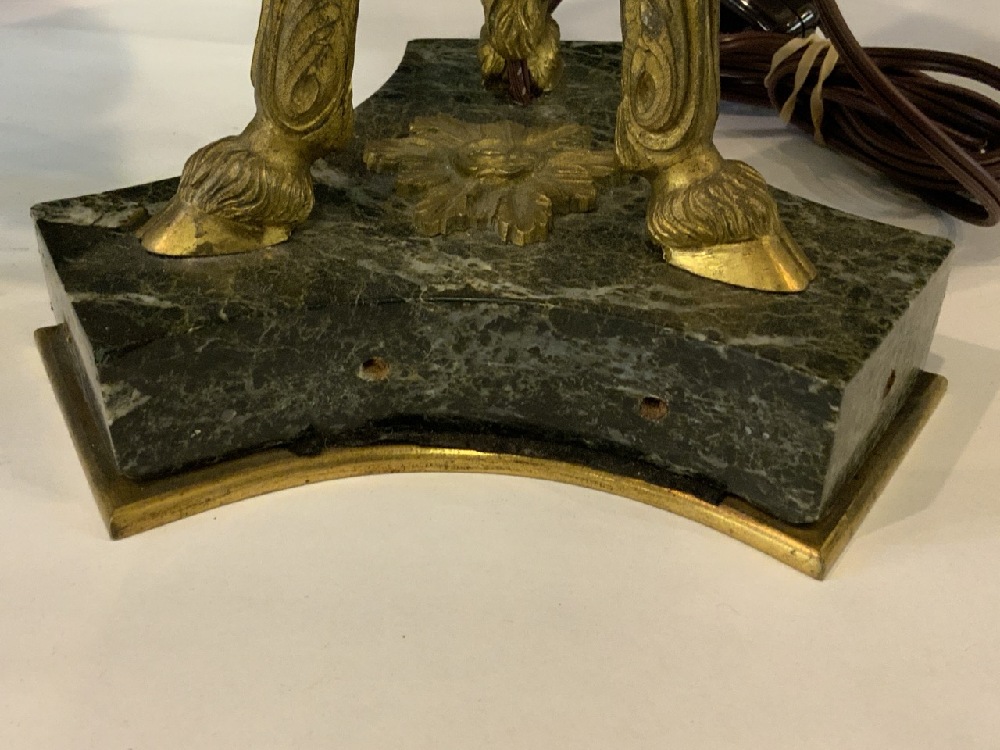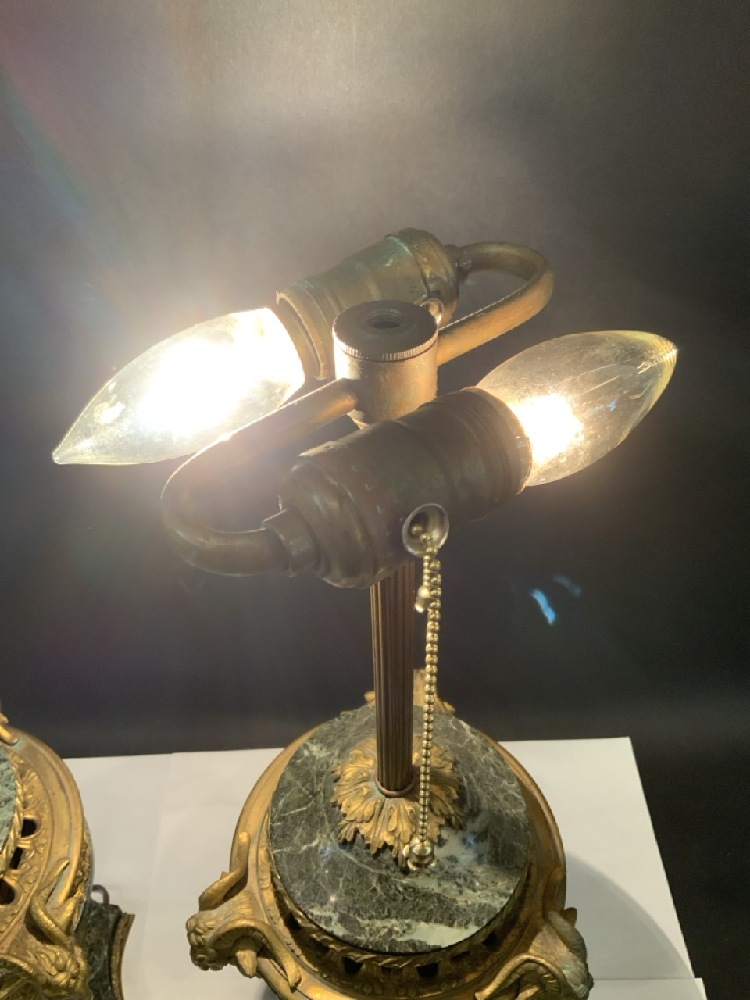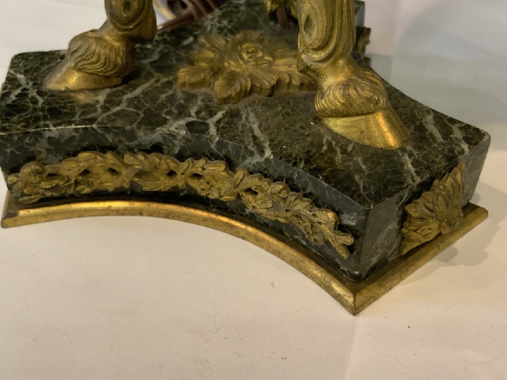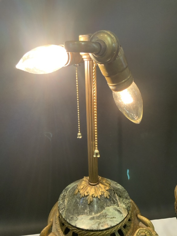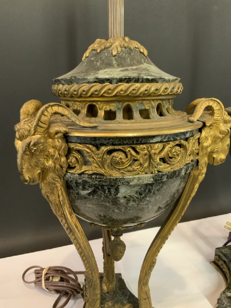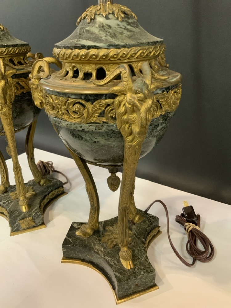 19th c. French Louis XV Bronze Ormolu and Green Marble Urn Table Lamps. Dimensions 31” H x 9” W x 7.5” D. Cracking brass piece on the base on one lamp. Brass is loose on the base of the other lamp Repair noted on the decorative brass head on one of the lamps.