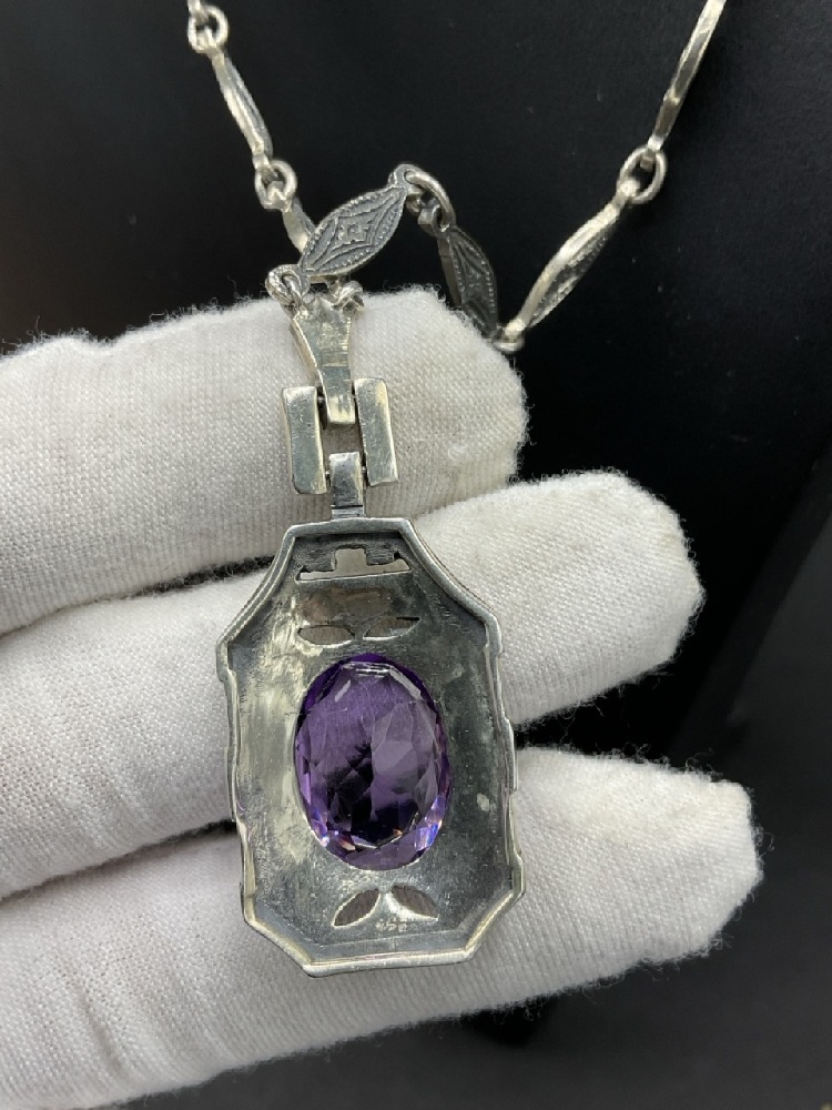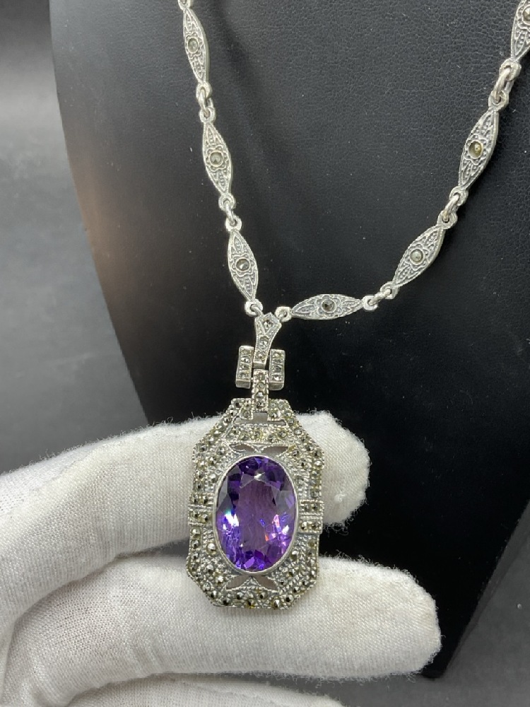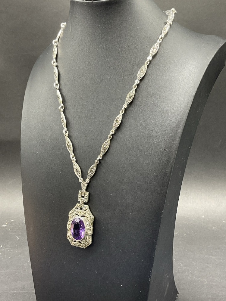 Edwardian Style Sterling Silver Amethyst and Marcasite Necklace