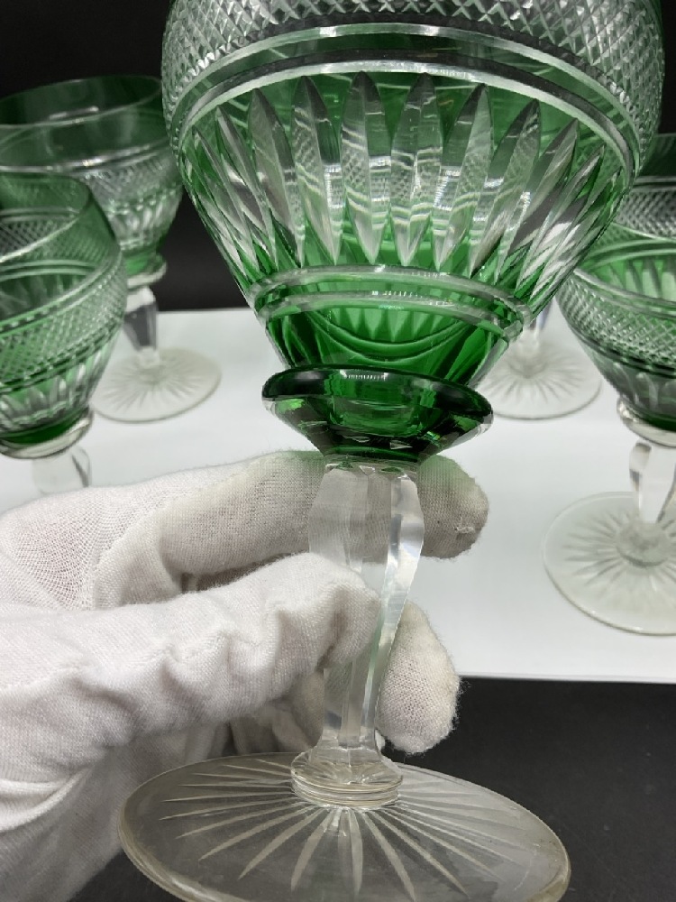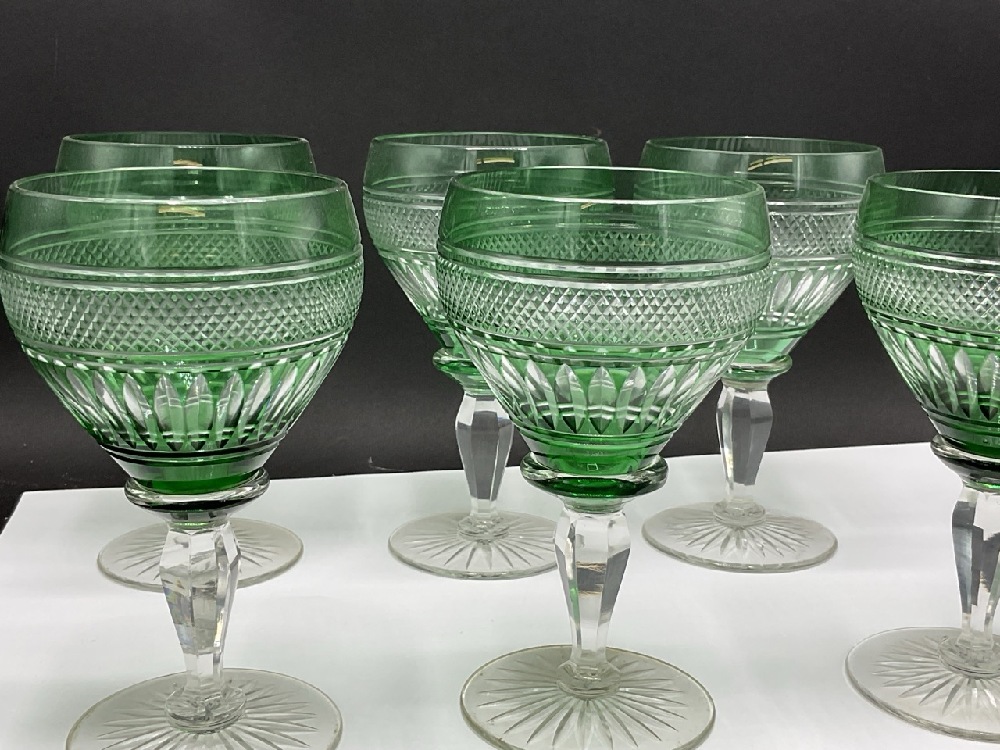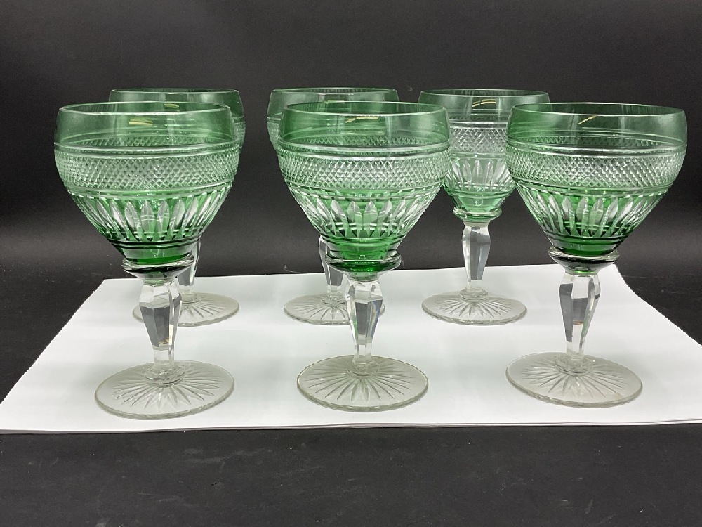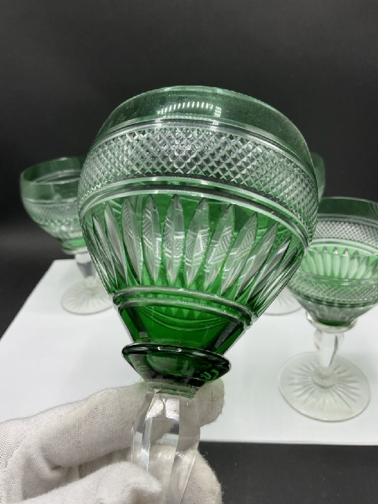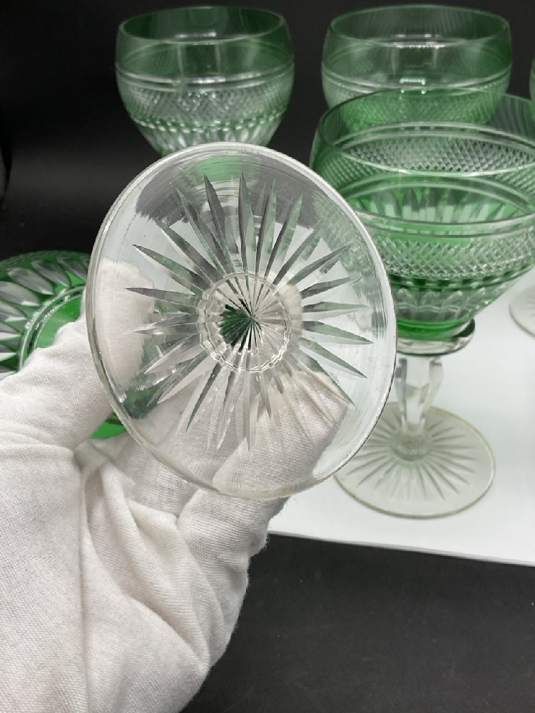 Six (6) Green Cut To Clear Crystal Goblets.