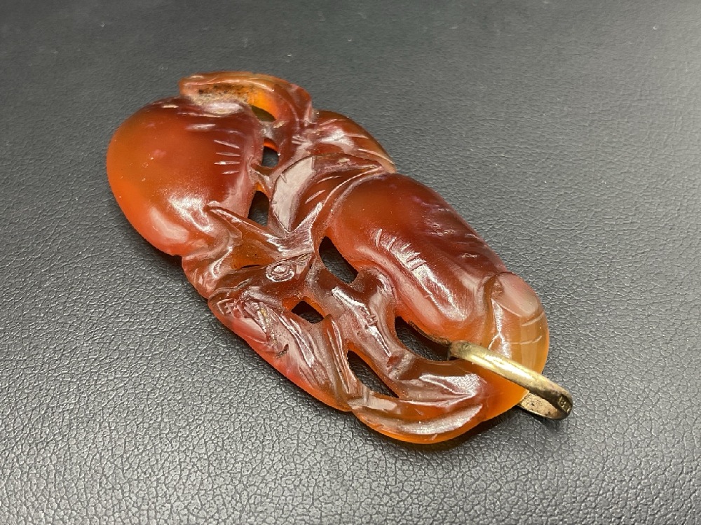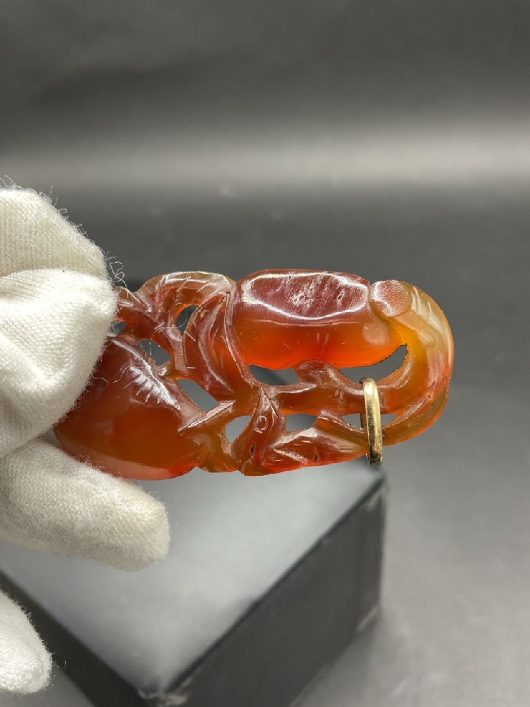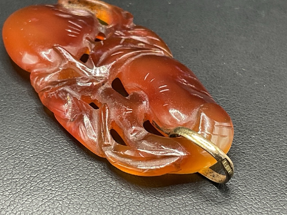 Carved Chinese Red Jade Pendant 18K Yellow Gold. Dimensions: 2”H x 1” W. Good Condition, Please see photograph preview.