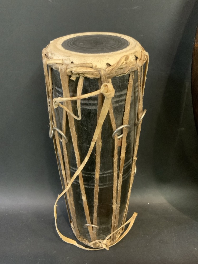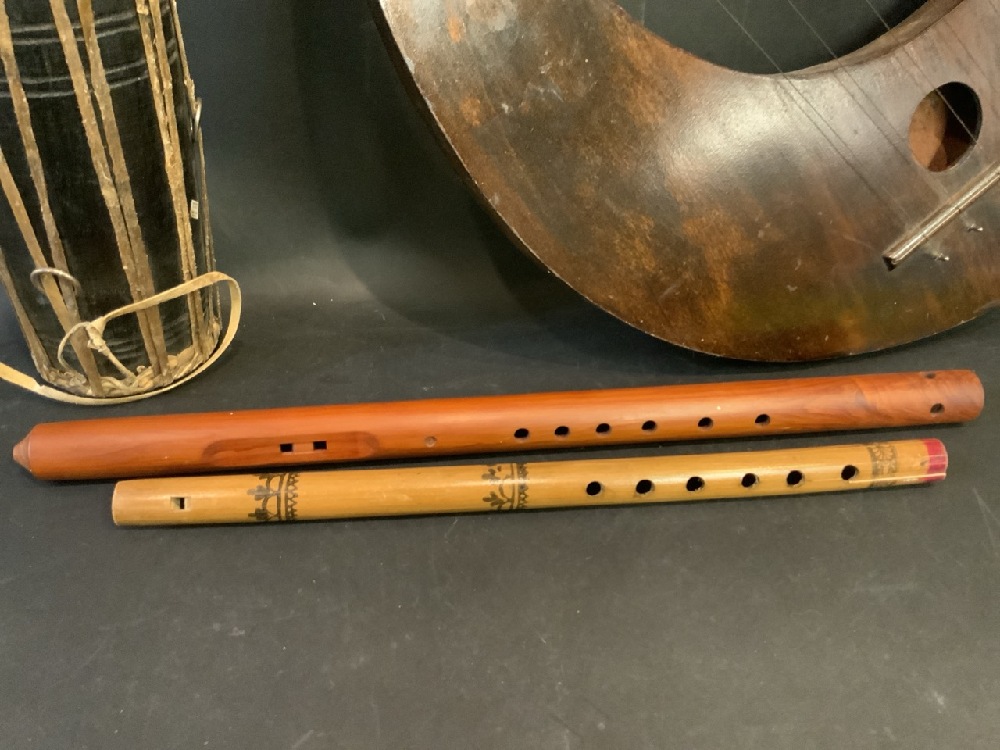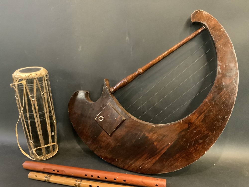 Instrument Grouping - Lyre Harp ca. 1920, Nepal Madal Drum and two (2) Wood Flutes.