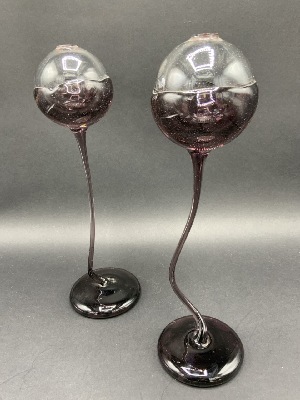 Pair of Heavy Amethyst Art Glass Tall Sculptured Oil Lamps. Dimensions: 11” x 3 1/4”