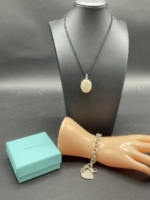 Two (2) Tiffany and Co. Sterling Silver Toggle Bracelet and Locket Pendant Necklace. Monogrammed Total weight: 45 grams.
