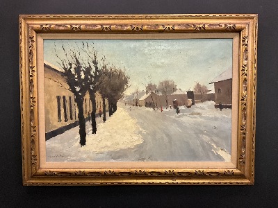 1930's Realism Winter Landscape Oil Painting Oil Painting. Artist Kusztek, B. signed lower right. Oil on Canvas Dimensions: 23 1/4” x 35 1/2” and 32 1/2” x 45” framed.
