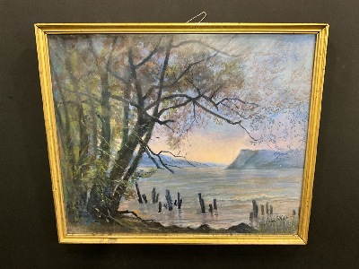 John Elliot Hudson River View from Piermont, NY (Rockland County) Pier Oil/Pastel Painting Dimensions: 20” x 24” and 21” x 25” framed.