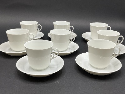Eight (8) Royal Copenhagen White Porcelain Cups and Saucers. Dimensions: 3” x 4”