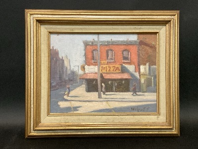 HAROLD WOLPOFF (MA, 1924-2013) Rockland Cty. Corner Street with Pizza Shop. Oil on Canvas . Dimensions: 14” H x 17” W framed.
