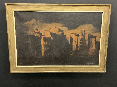 Along the Arno, Florence by Moonlight. Oil on canvas. 1st half 20th century. Illegibly signed verso. Dimensions: 15” x 23” and 19” x 27”