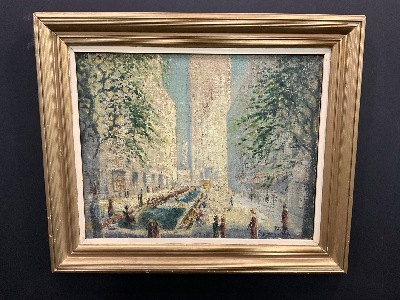 Eric Maunsbach (1890-1969)Radio City and Rockefeller Center Winter Scene in New York City Oil painting on board. Dimensions: 18 1/2" X 23 1/2" Signed verso.