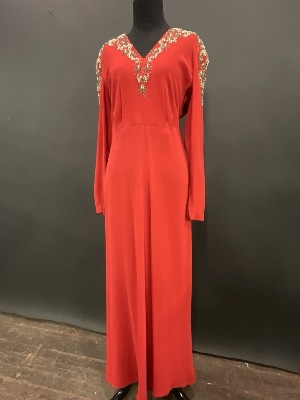 Claire McCardell Red Bugle Beaded Evening Dress. Original owner. Dimensions: Approx. Size U.S. 8. 28” Waist 32” Chest 24” Arm Length Total Length 60”