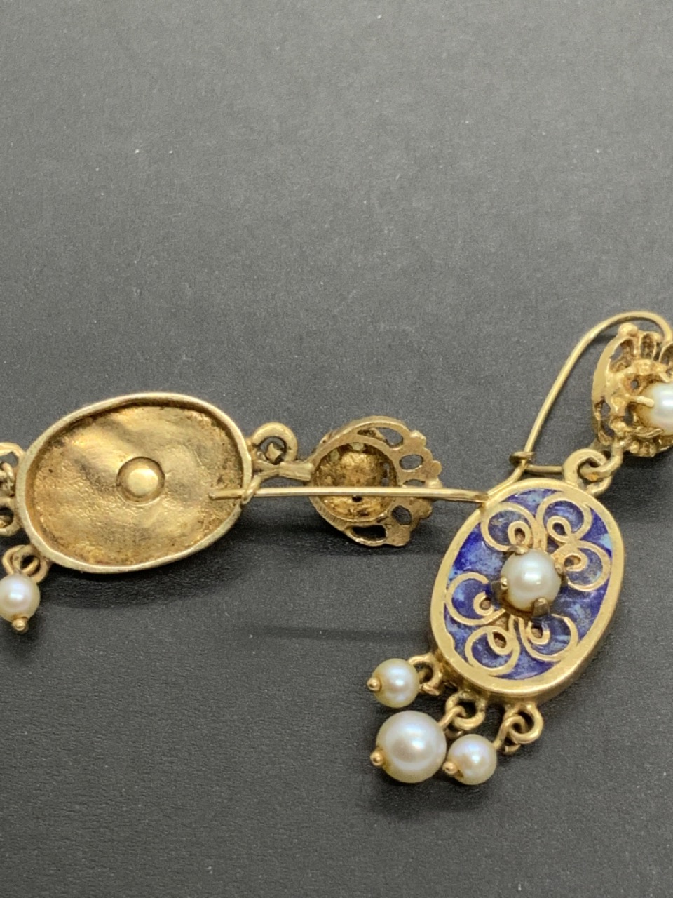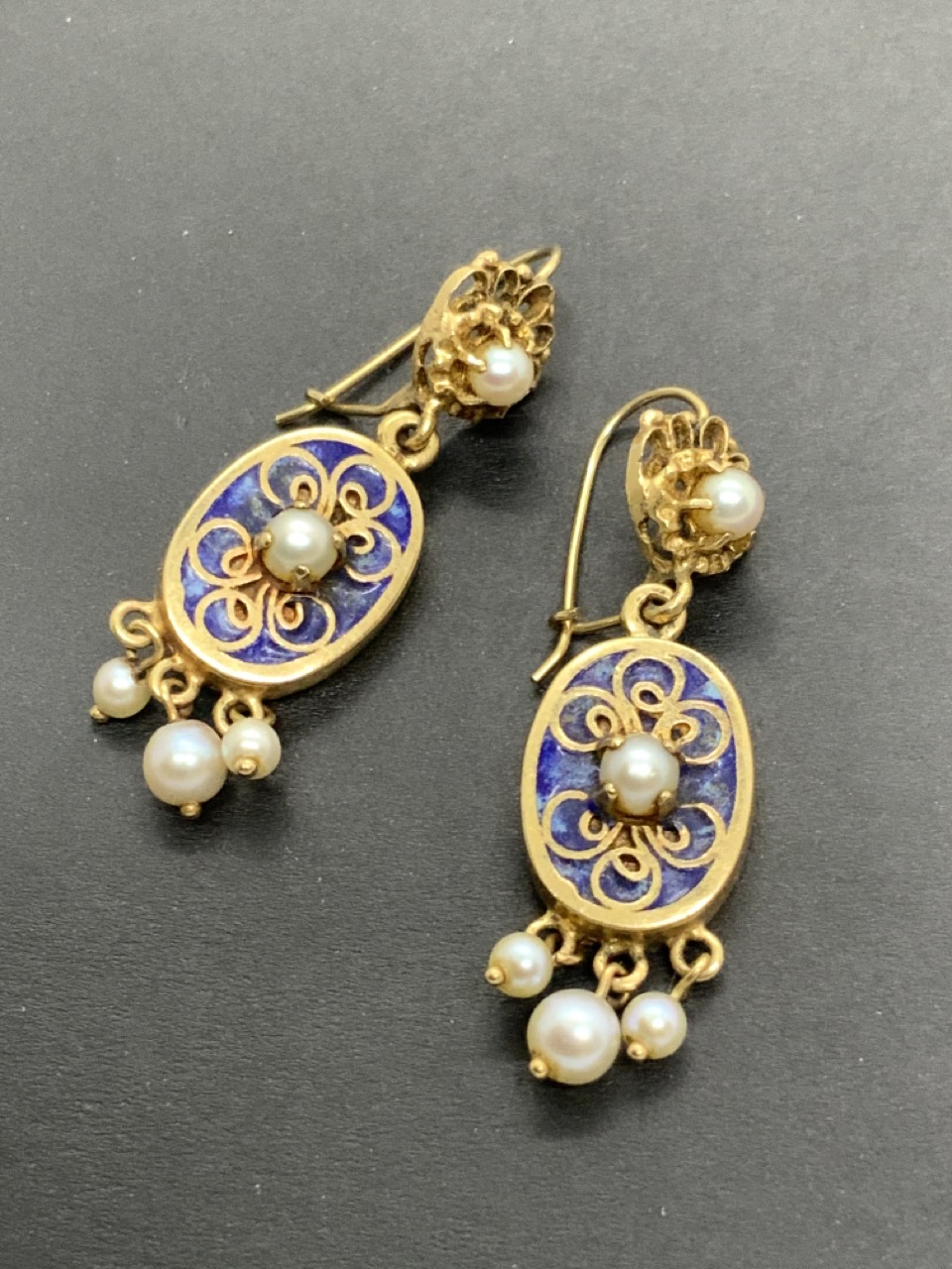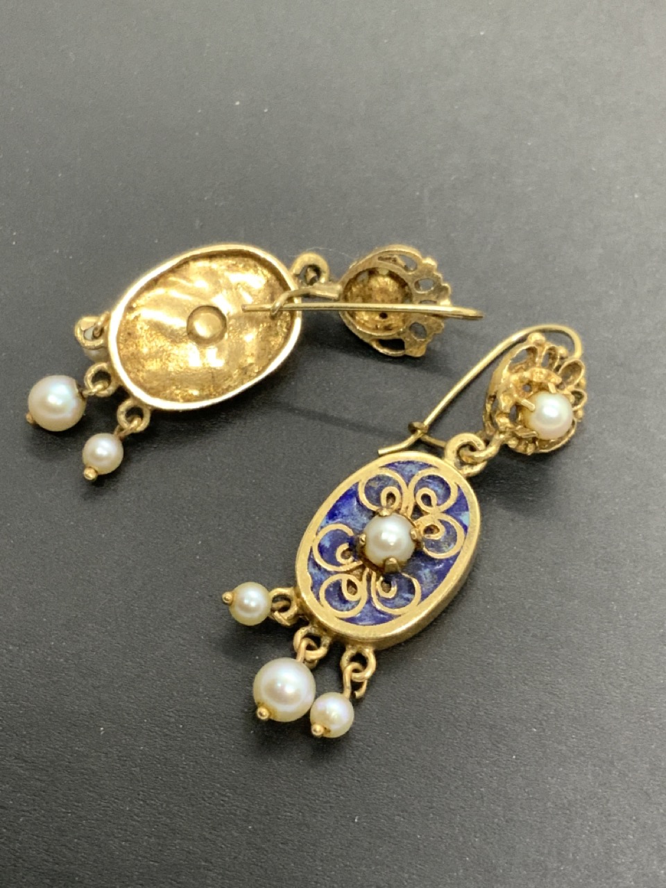 14k yellow gold blue enamel filigree drop earrings with freshwater pearls.