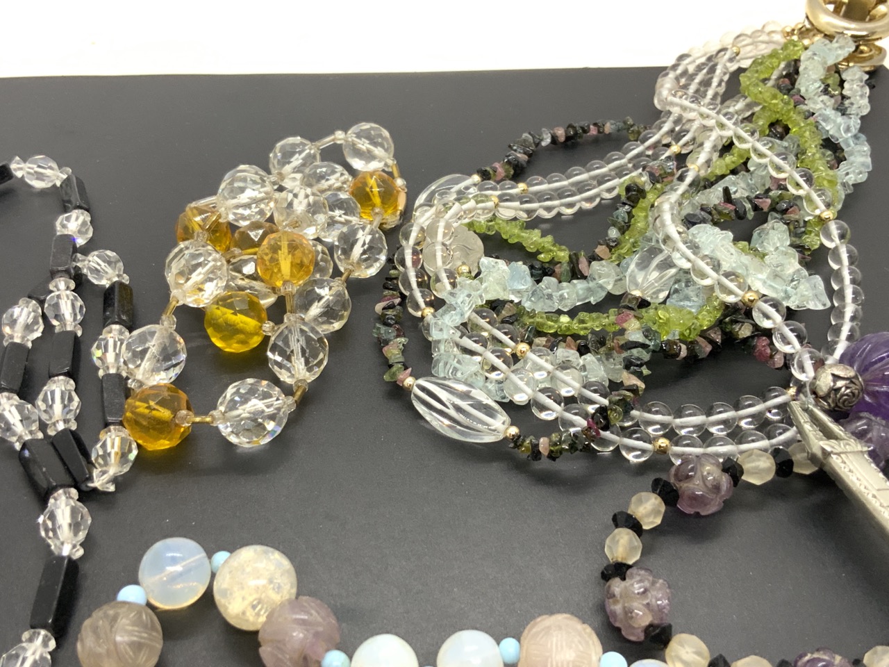 An estate compiled grouping of glass necklaces, Chinese influenced etc. Mostly vintage. As seen in photograph preview.