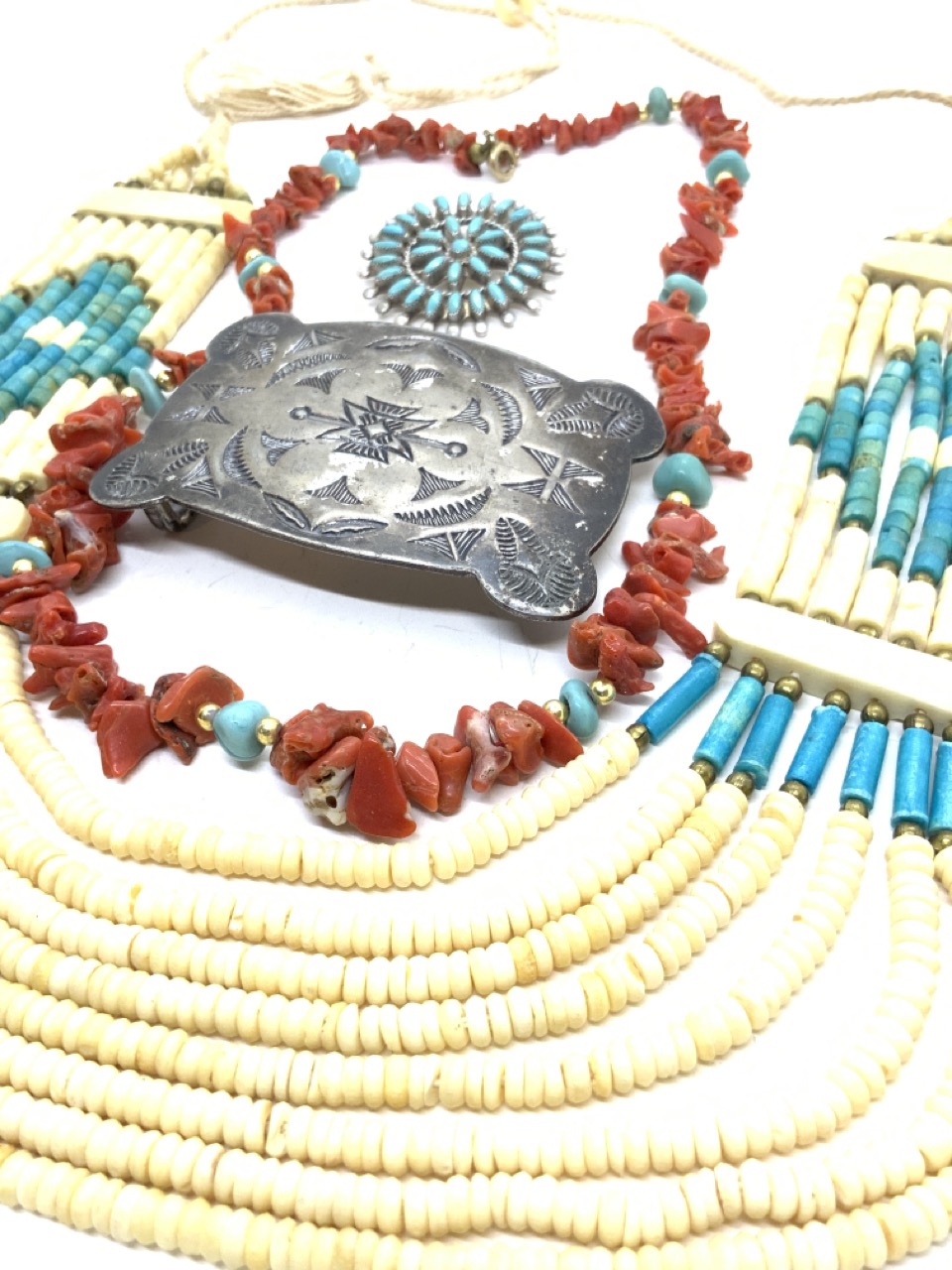 An estate compiled grouping of American Indian jewelry including bone and turqouise necklace, coral, Zuni tribed signed silver pin and silver belt buckle.