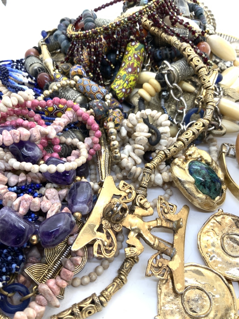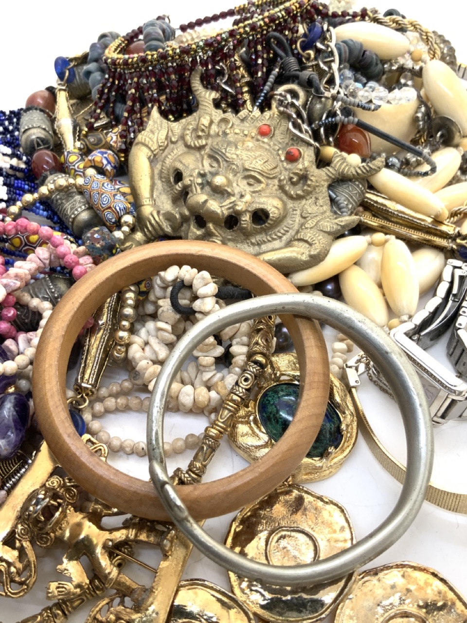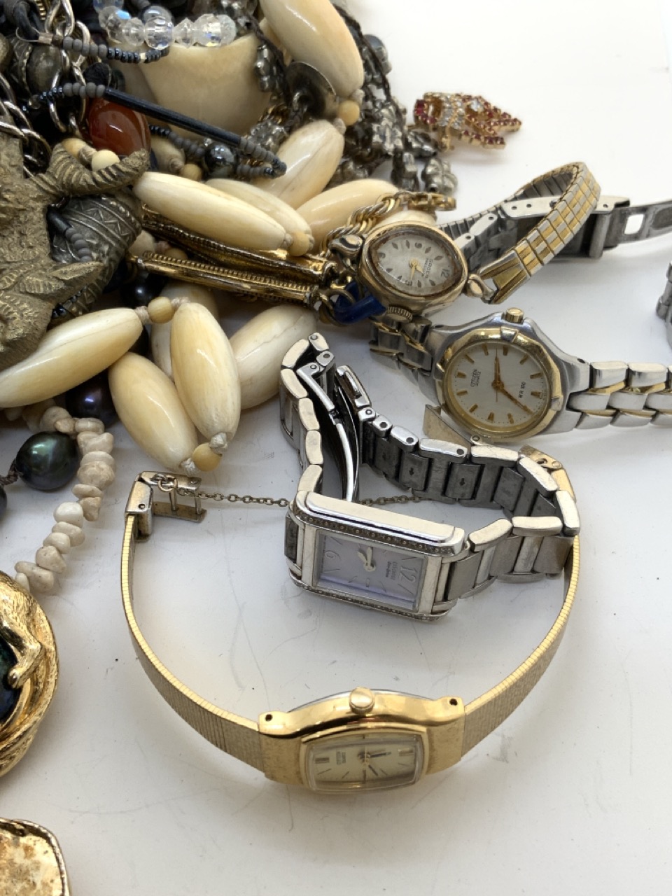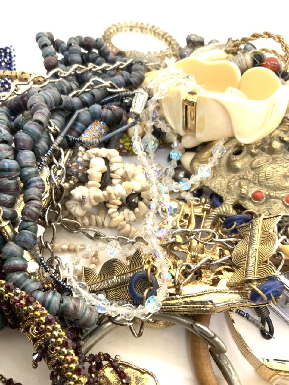 A compiled grouping of estate costume jewelry including glass beads, stones, fashion watches and pin etc.