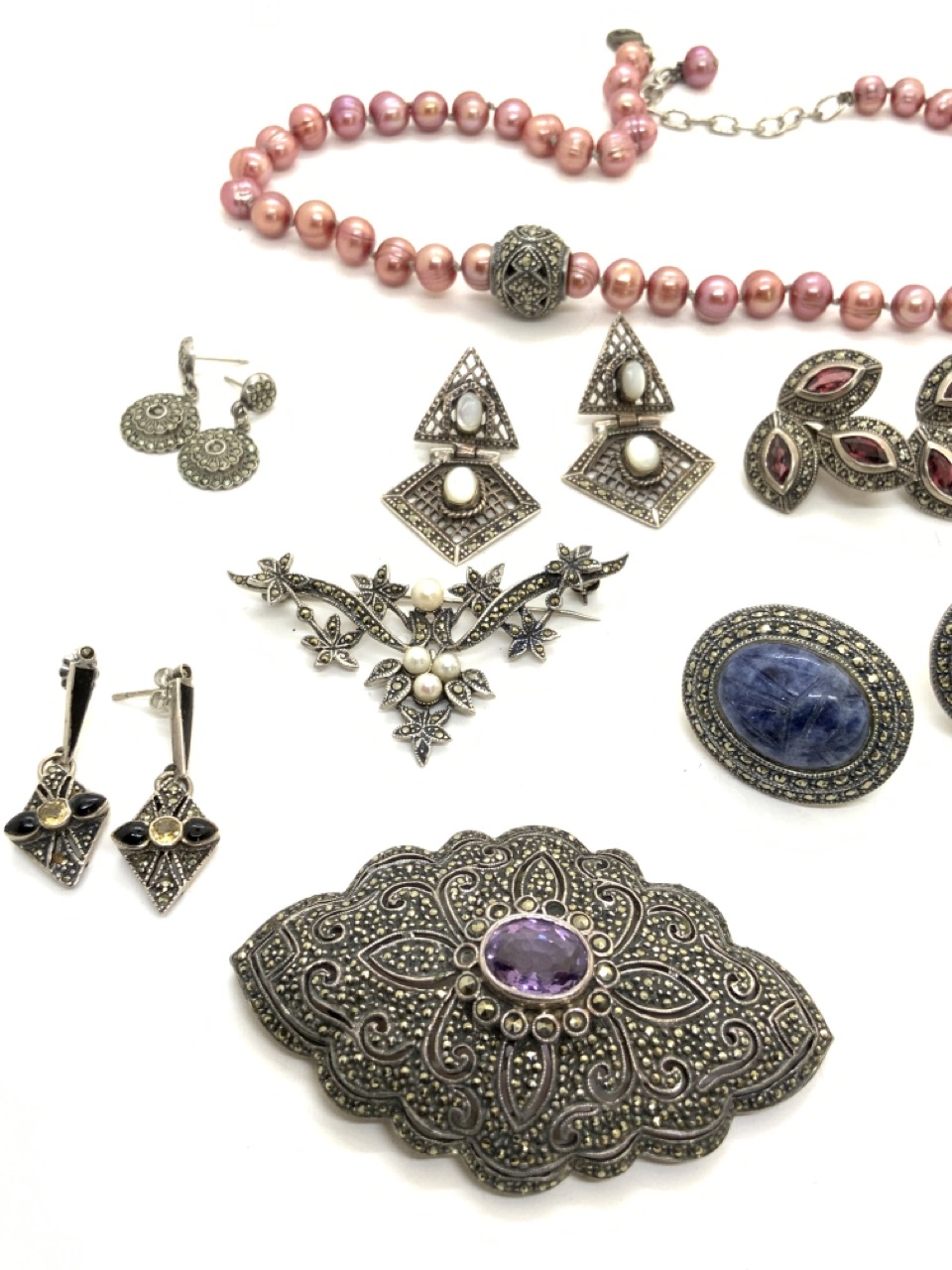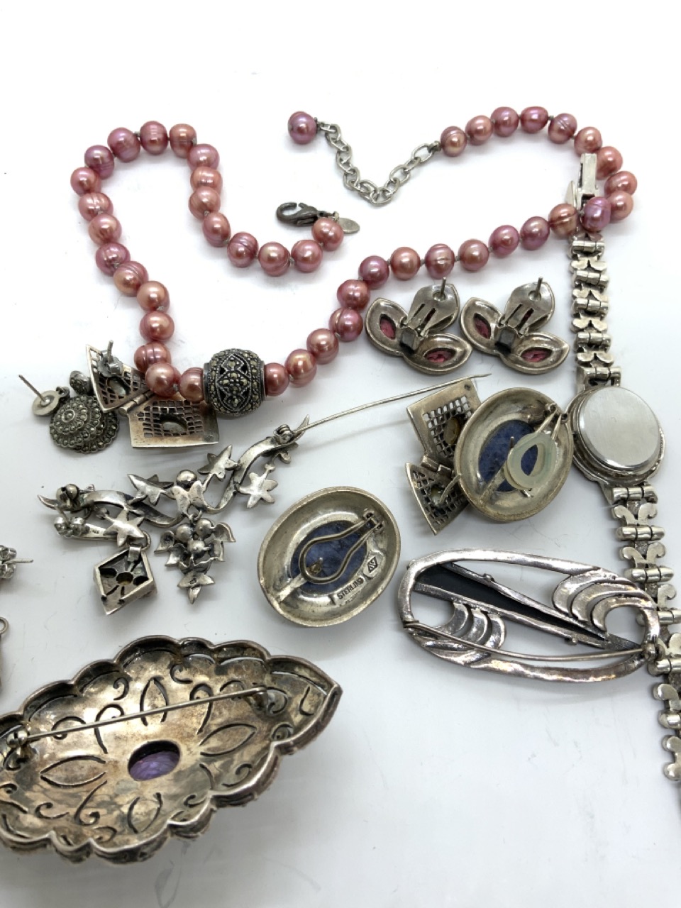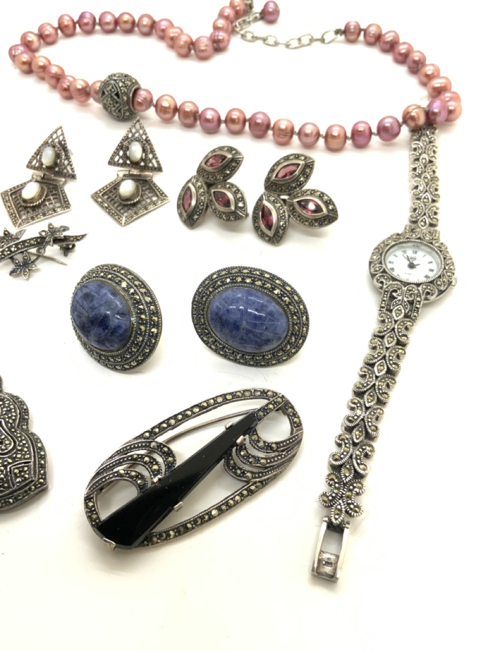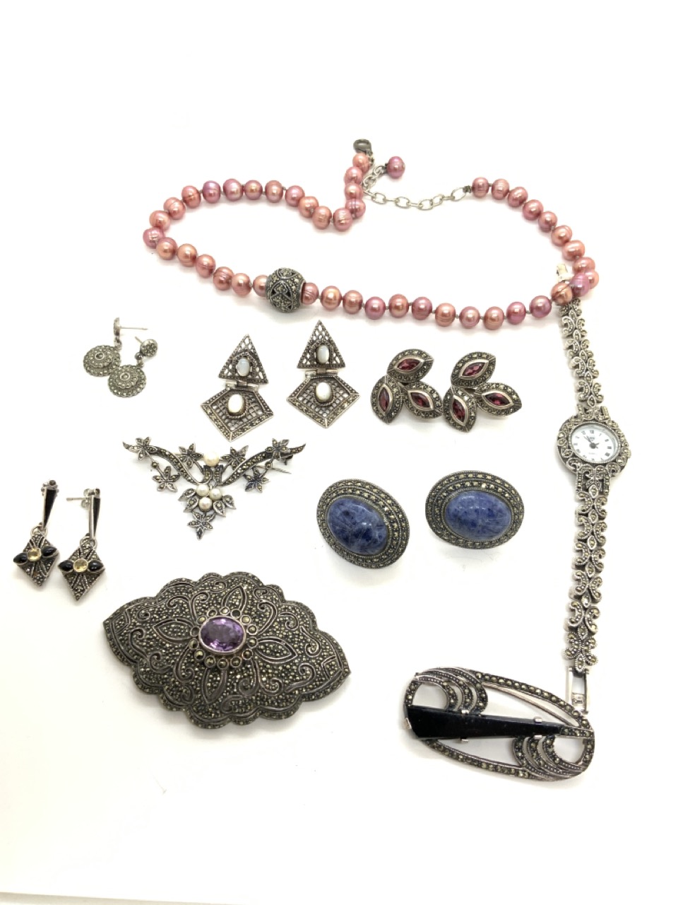 Sterling silver marcasite jewelry group with lapis Judith Jack pierced earrings, pins with pearls, opals and onyx , large amethyst sterling silver pin, fashion watch etc.