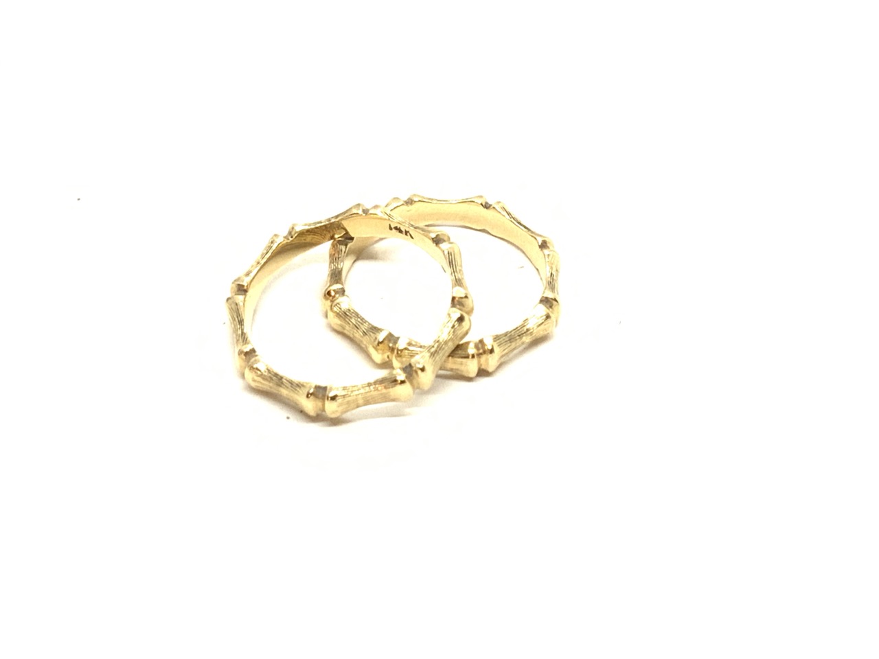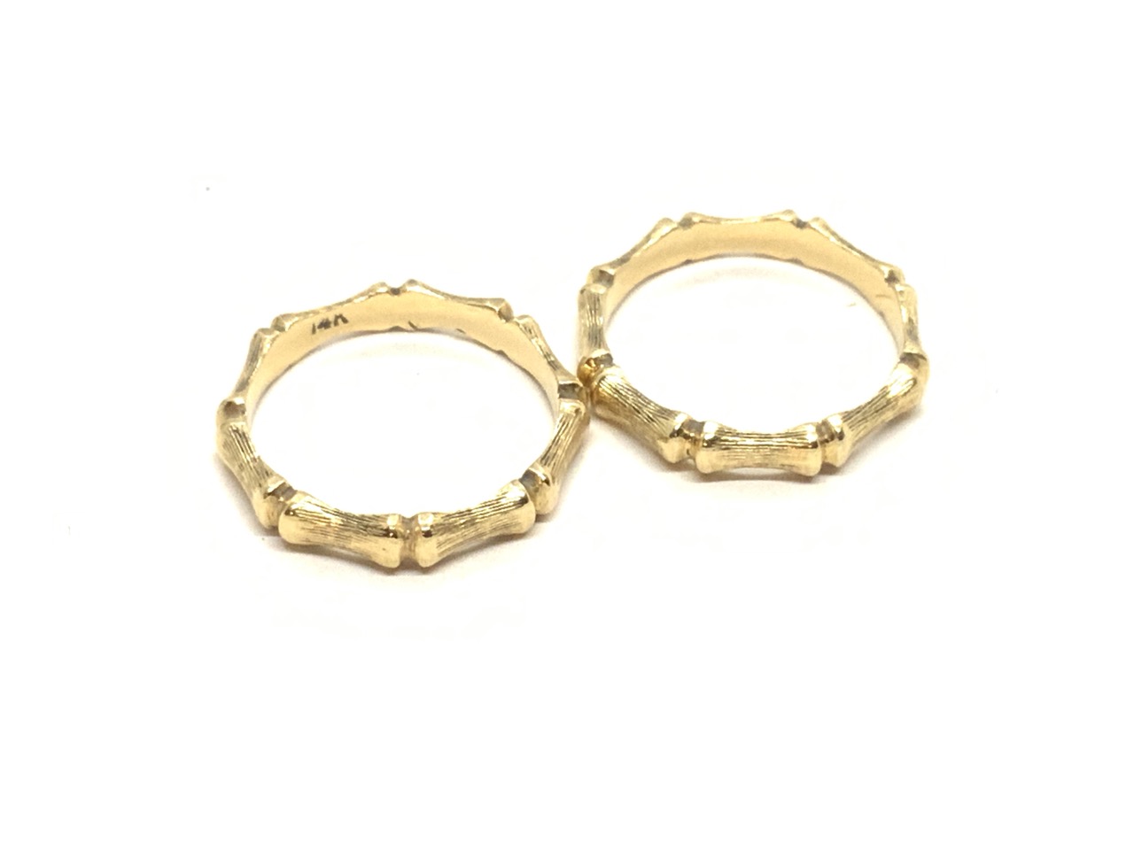 Matching pair of 14k yellow gold bands with a bamboo trunk pattern.