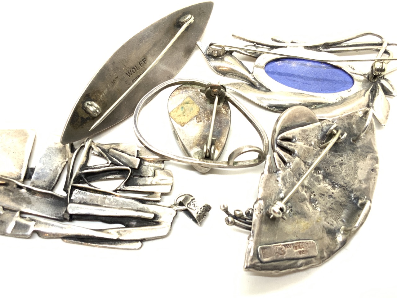 Five piece sterling silver modern design pins including Israeli, Mexican, Wolff etc.