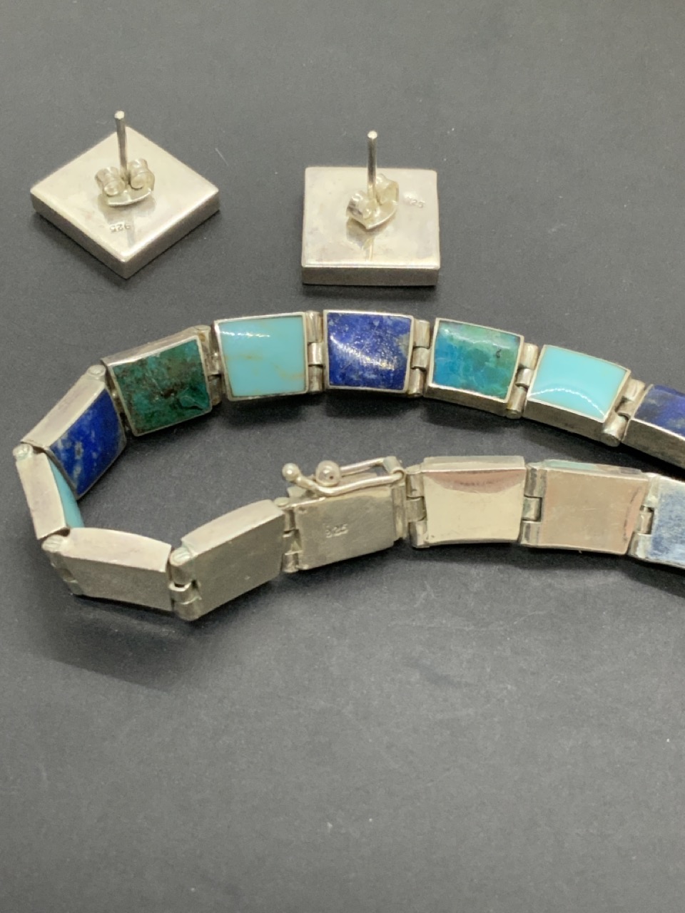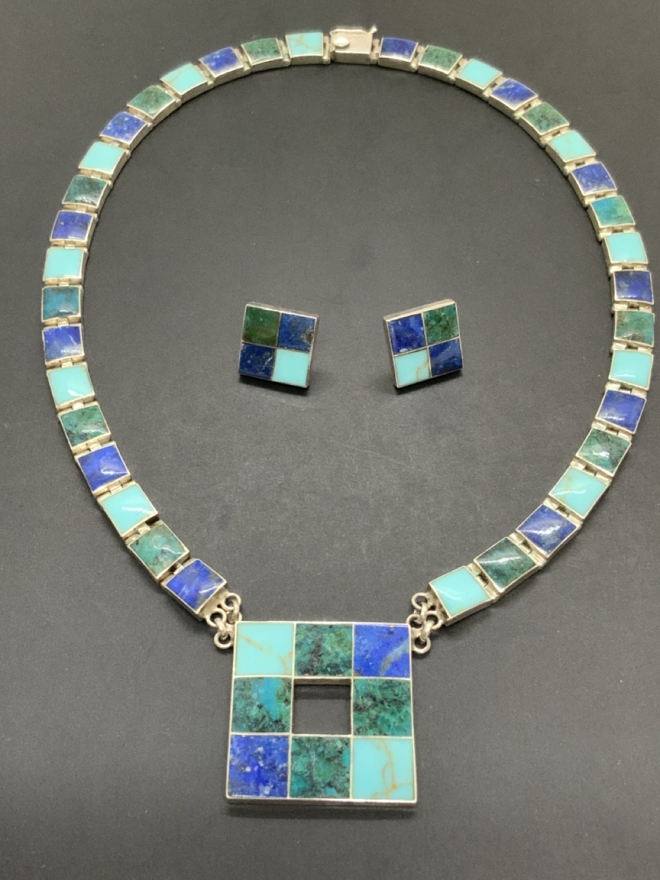 Sterling silver geometric lapis and turquoise necklace and earrings set.