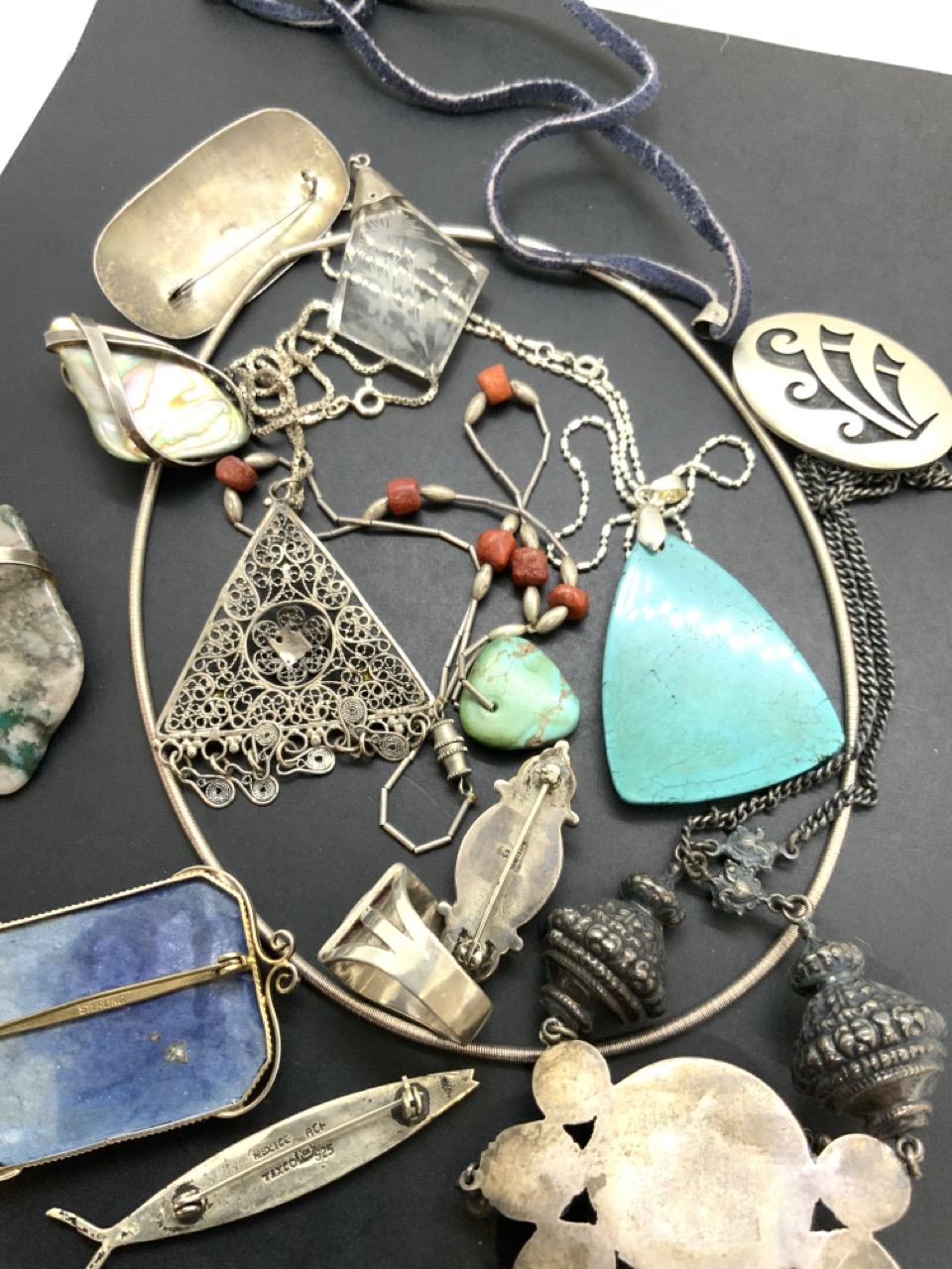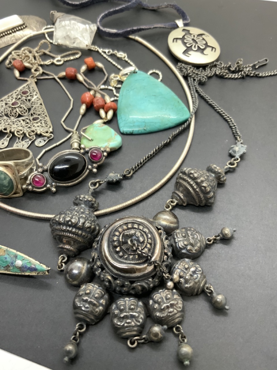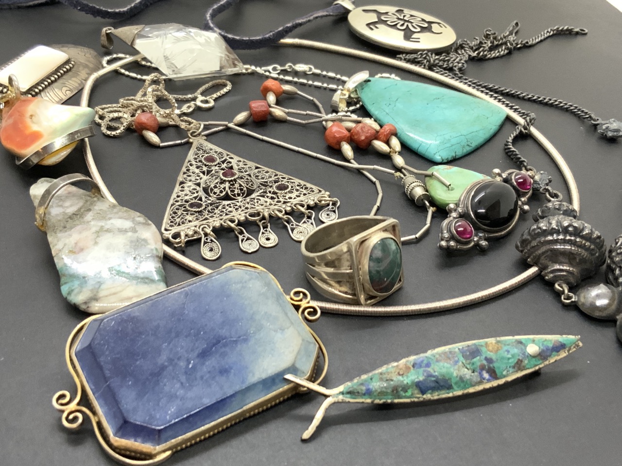 A compiled grouping of vintage jewelry including sterling silver lapis, abalone, turquoise etc.