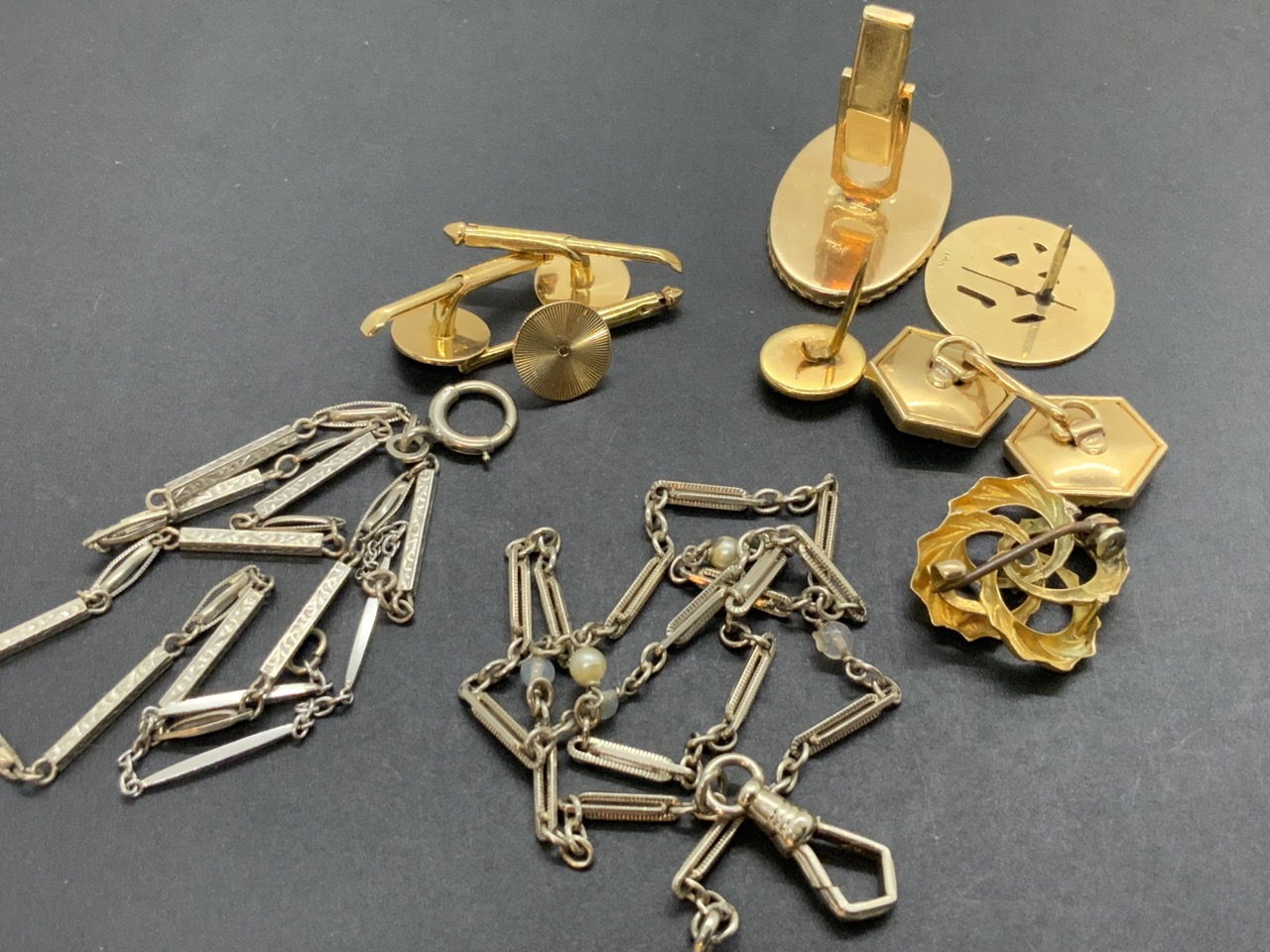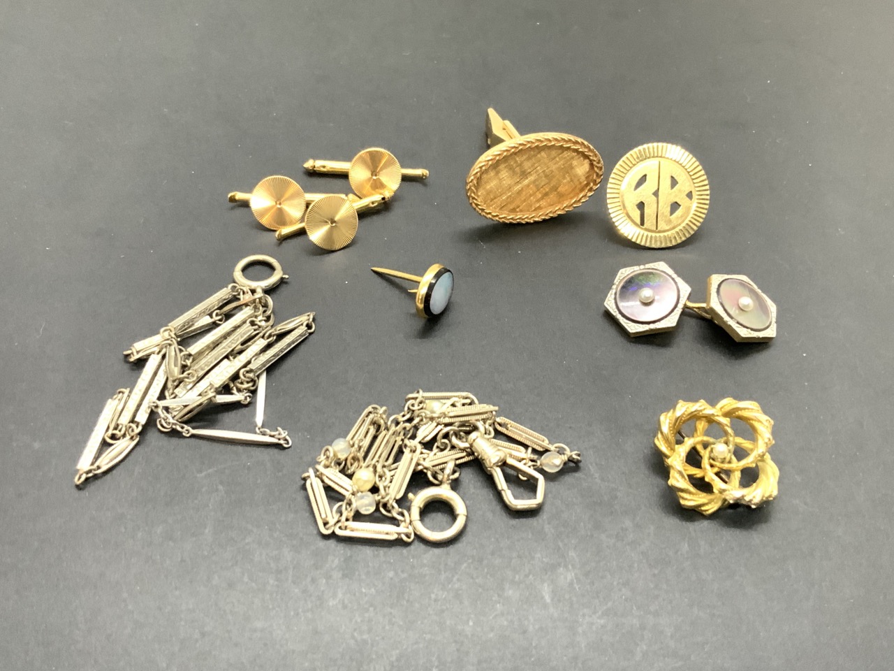 Assorted men's jewelry group. 14k single cufflink, tie tacks, two 14k w.g. fob chains etc.