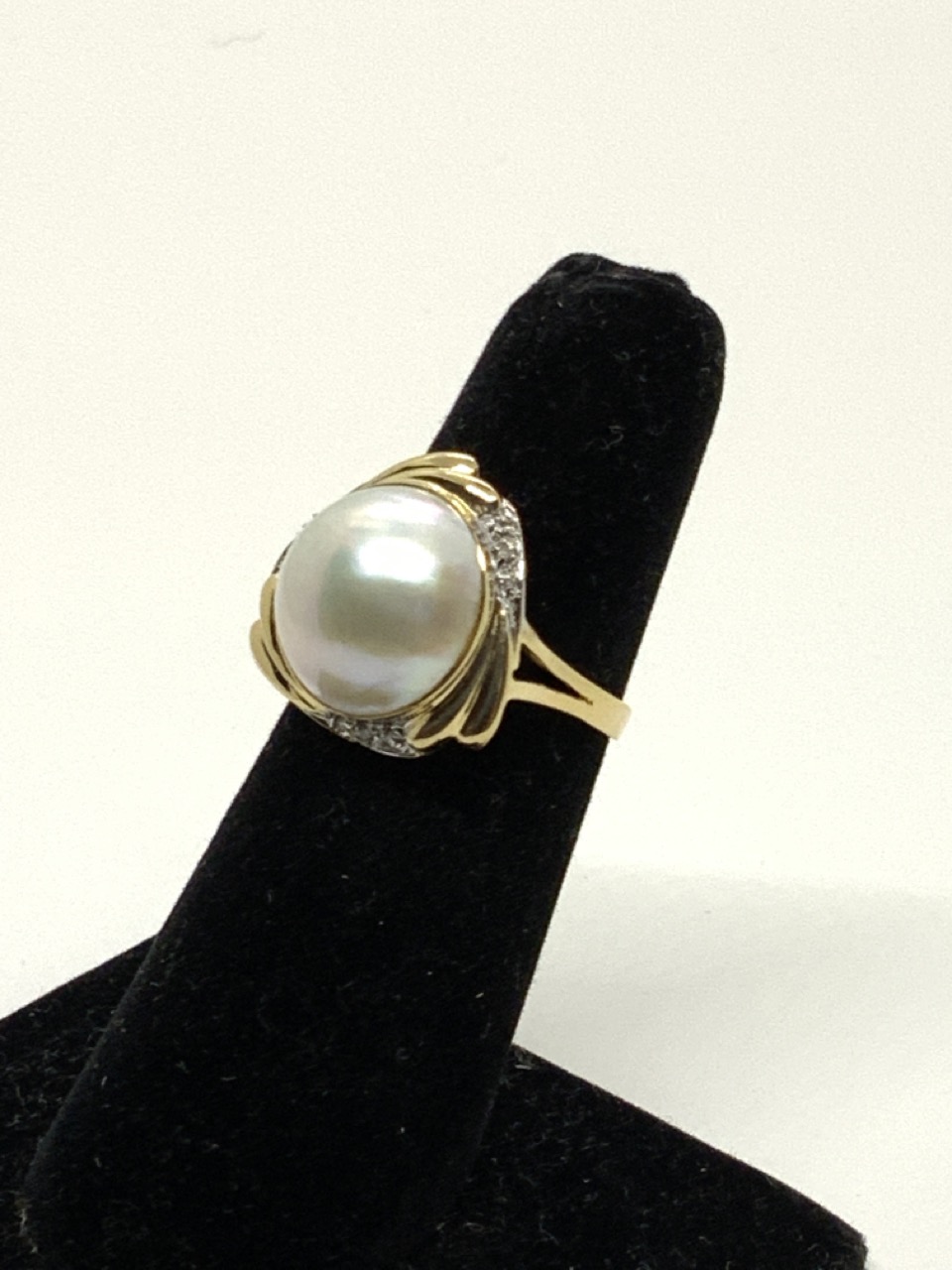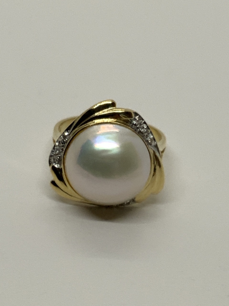 18k y.g. Mabe pearl and diamond ring. Total of nine diamonds.