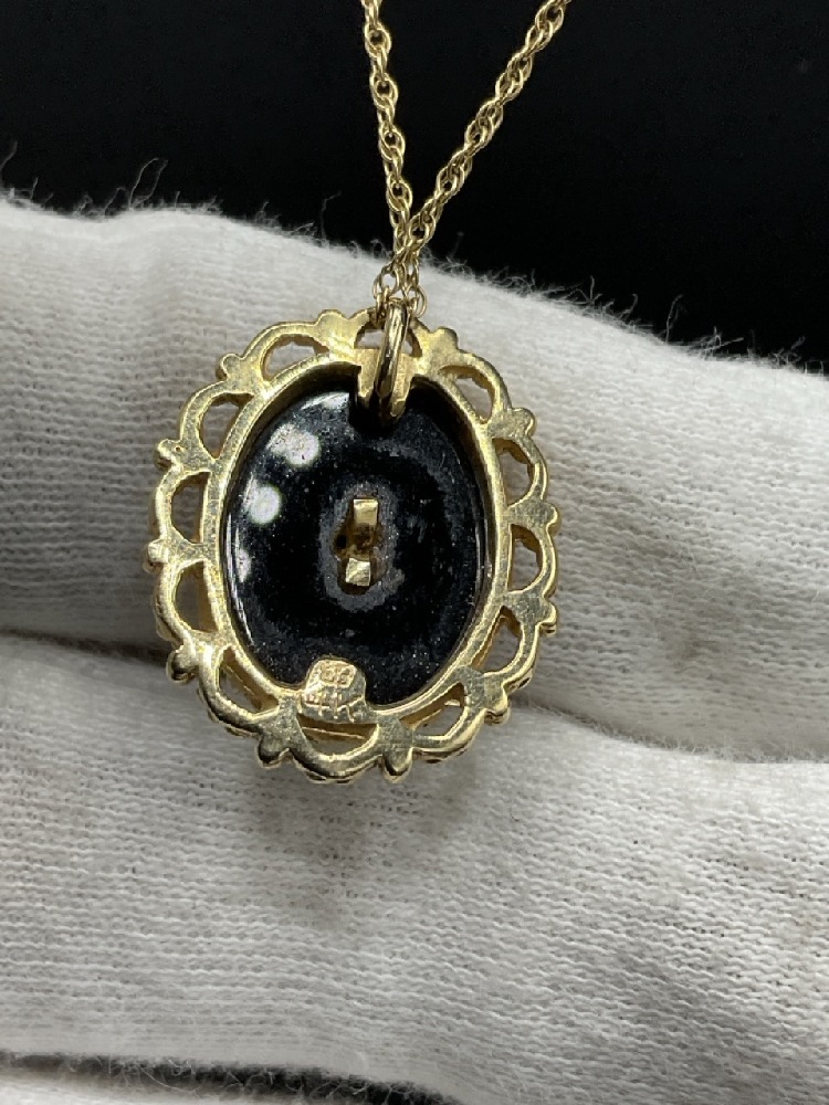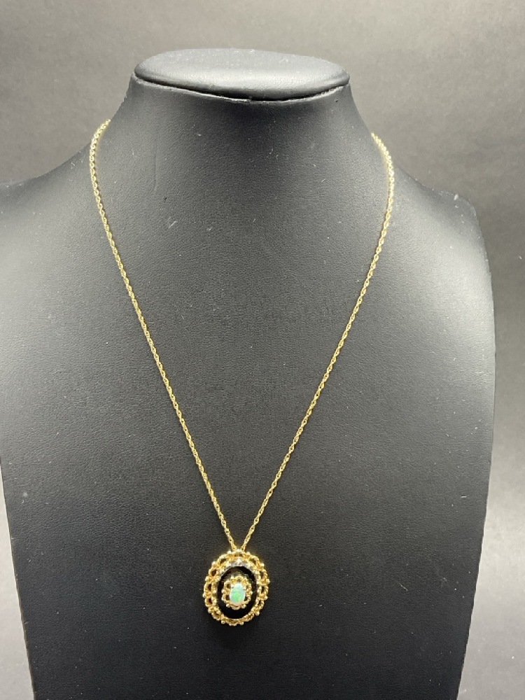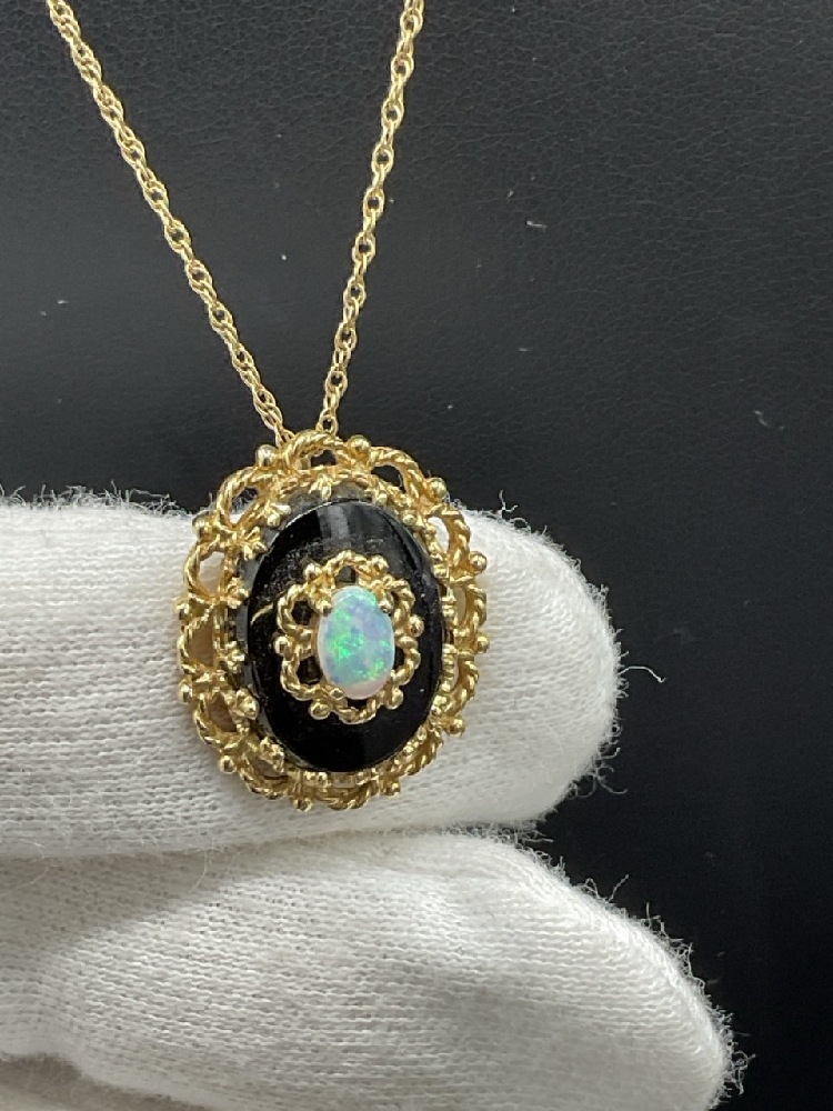 14K Yellow Gold Opal and Onyx Pendant with Chain. t.w: 5.06 grams.