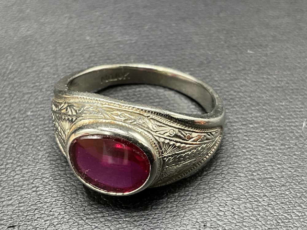 10K White Gold Ring with Ruby Colored Stone.
