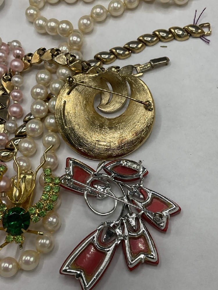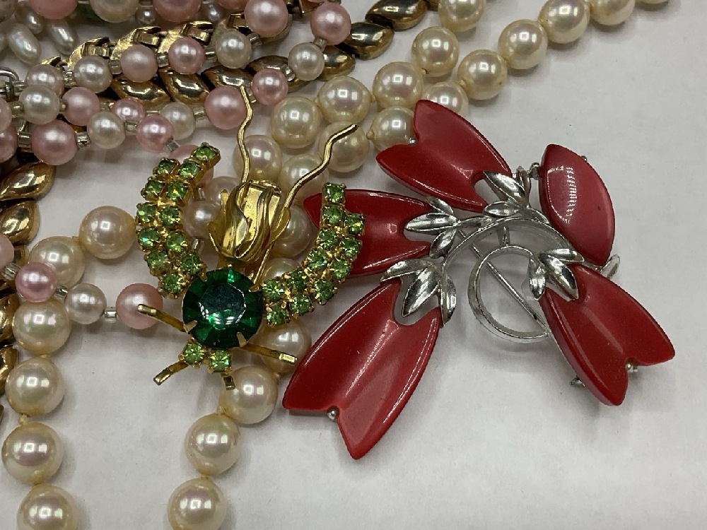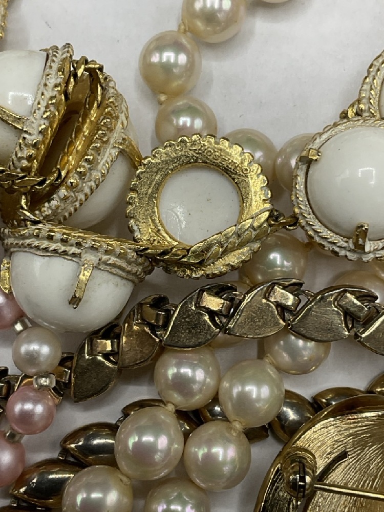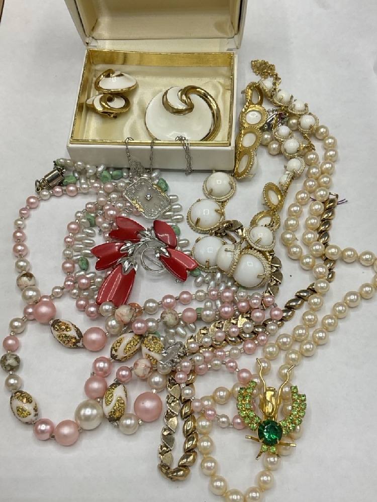 Compiled Vintage Costume Jewelry Grouping- Trifari, Lisner, Mosell, Crown Trifari Brooch and Earrings set with original box, Necklaces etc. As seen in photograph preview.