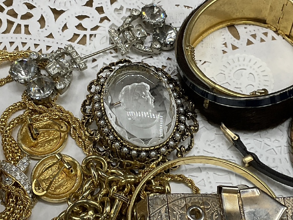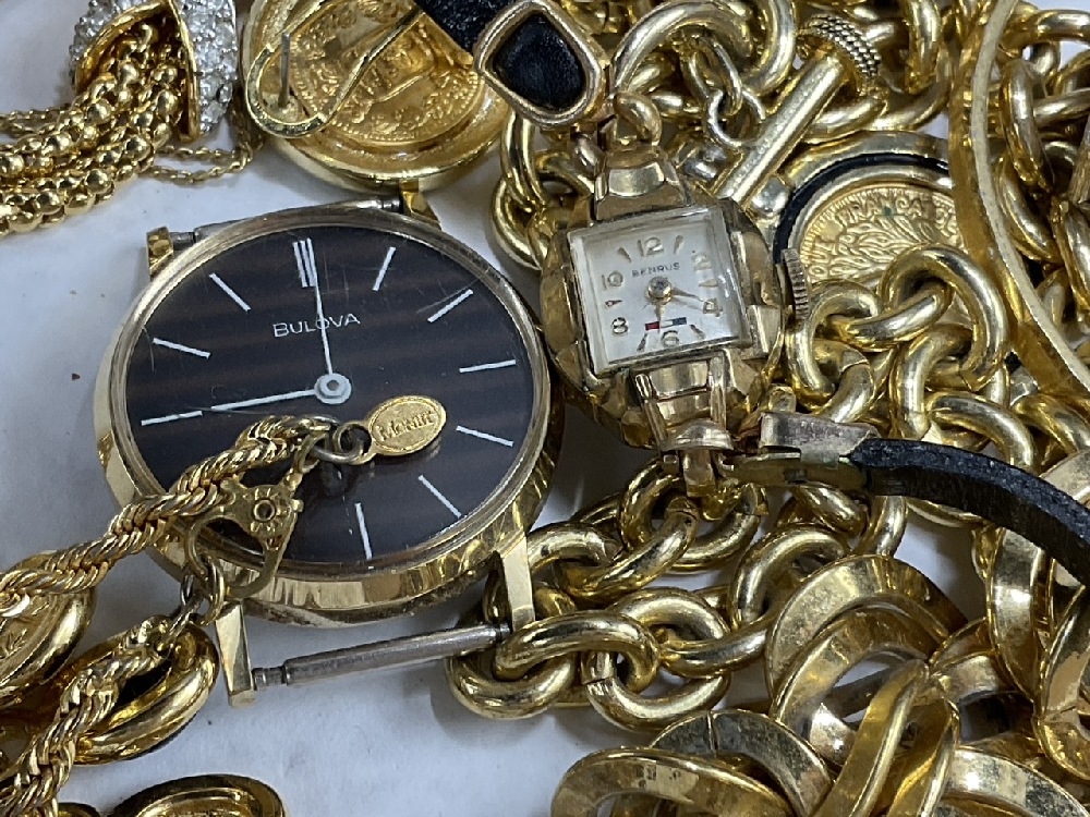 Vintage Gold Tone Costume Jewelry Lot - Bulova, Monet, Benrus. As seen in photograph preview.