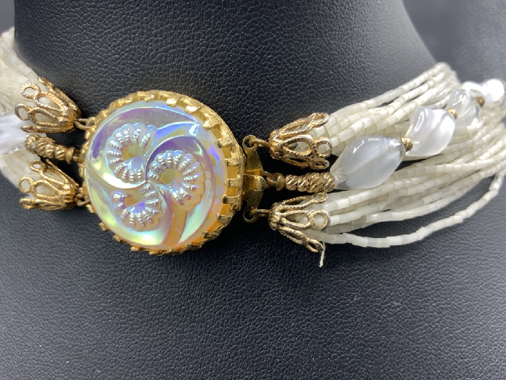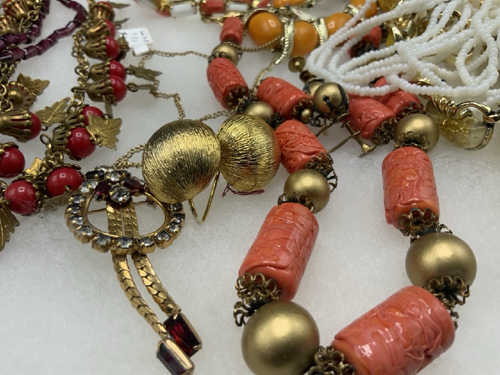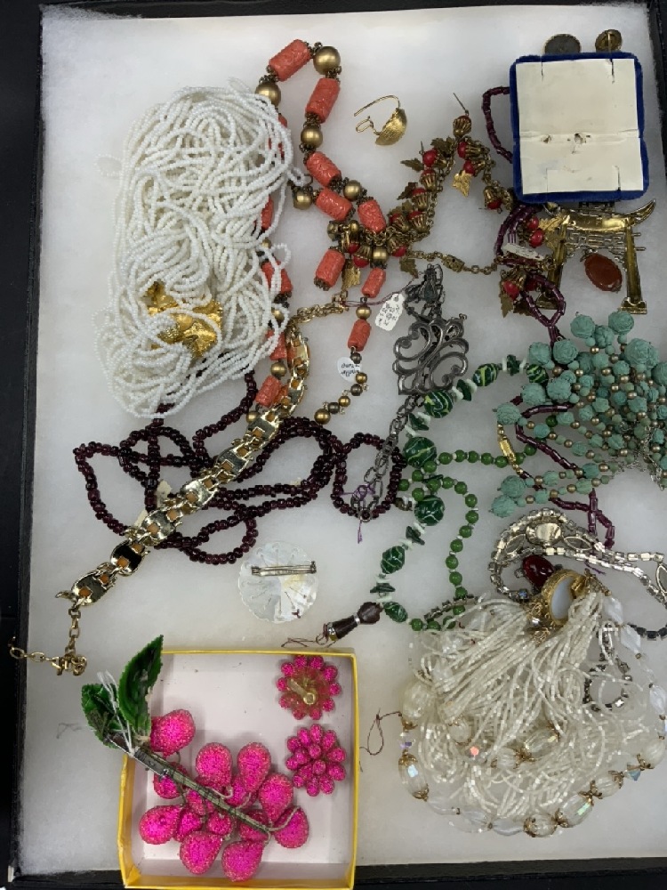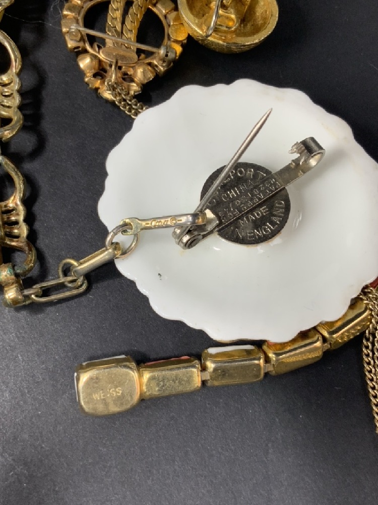 Estate Compiled Costume Jewelry Group Weiss, Coro, Coalport. Vintage Glass, Plastic, Queen Elizabeth porcelain pin, stick pins etc. As seen in photograph preview.
