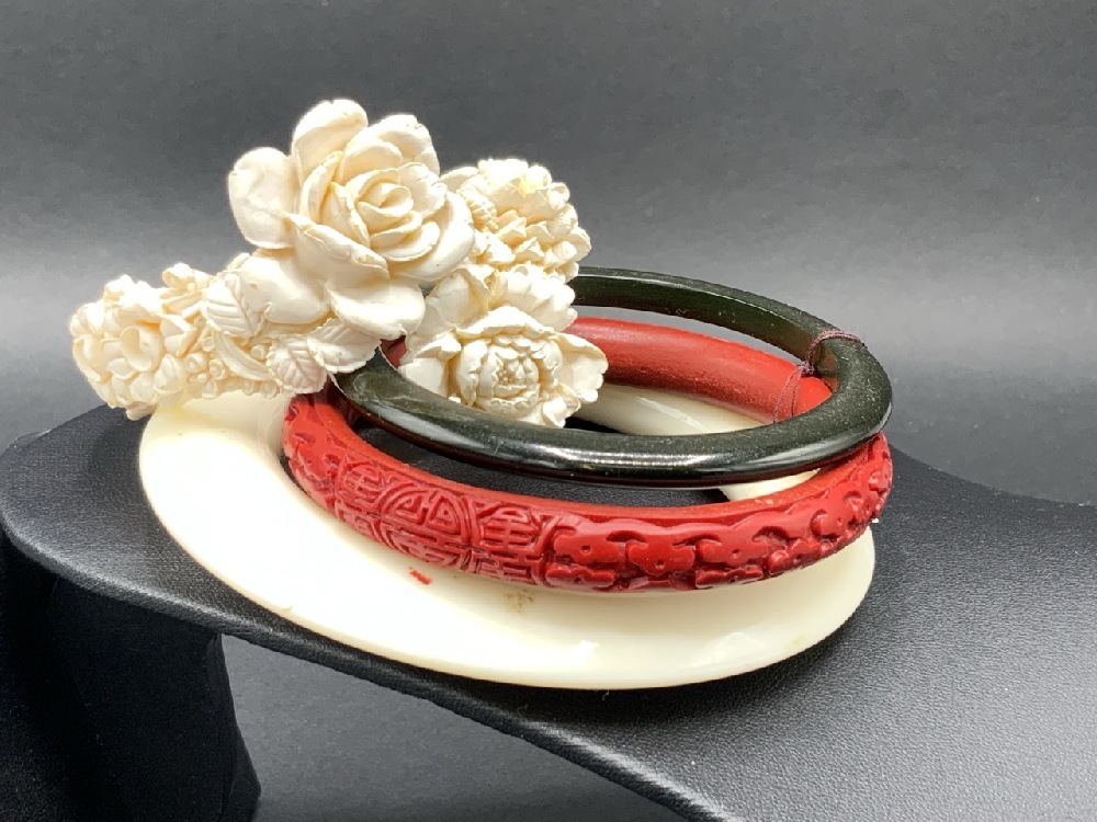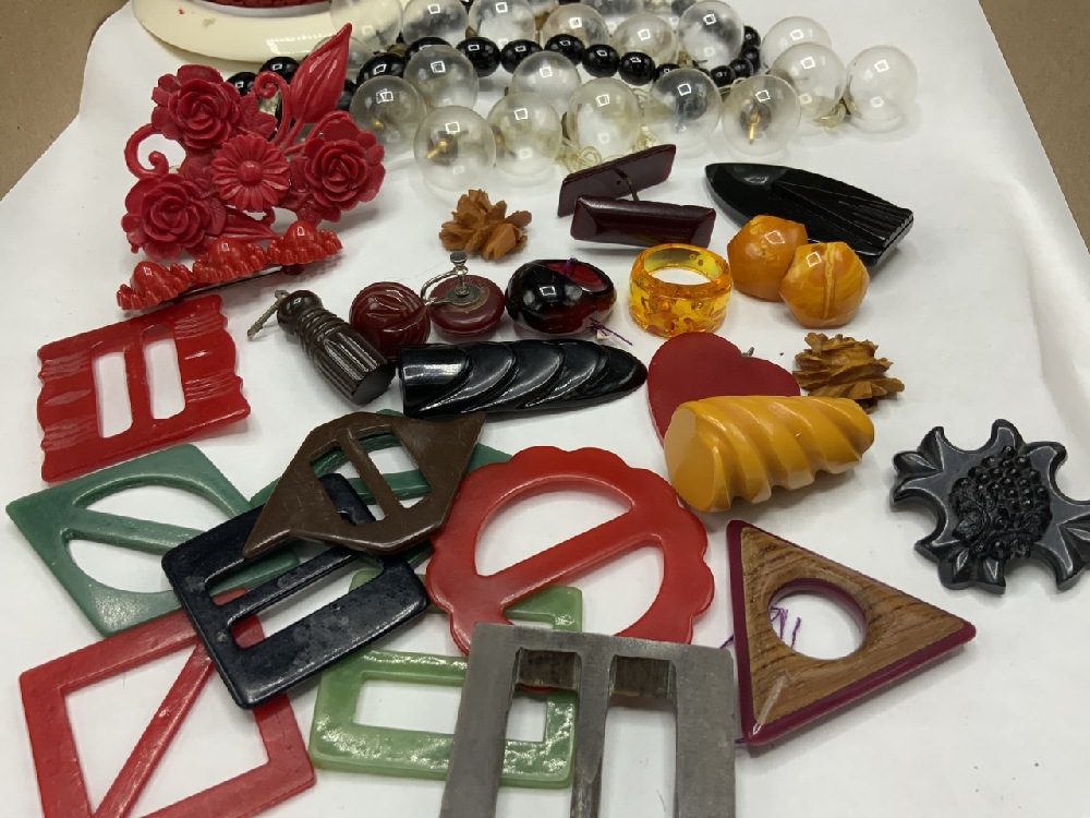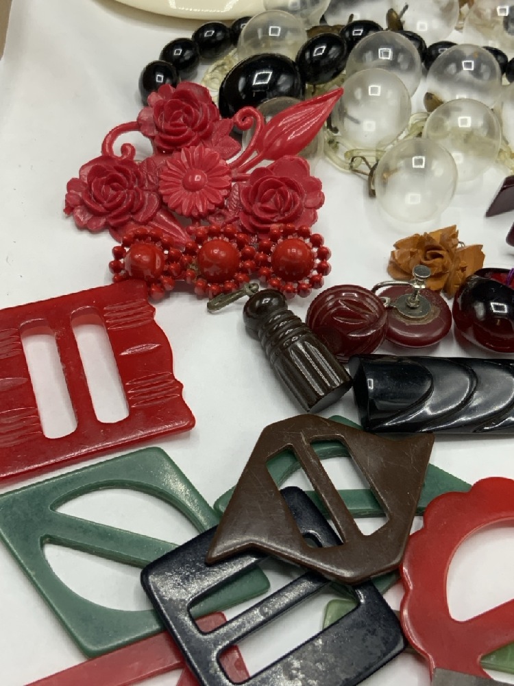 Compiled Vintage Plastic and Bakelite Jewelry Group. As seen in photograph preview. Nice early necklaces, buckles, bracelets etc.