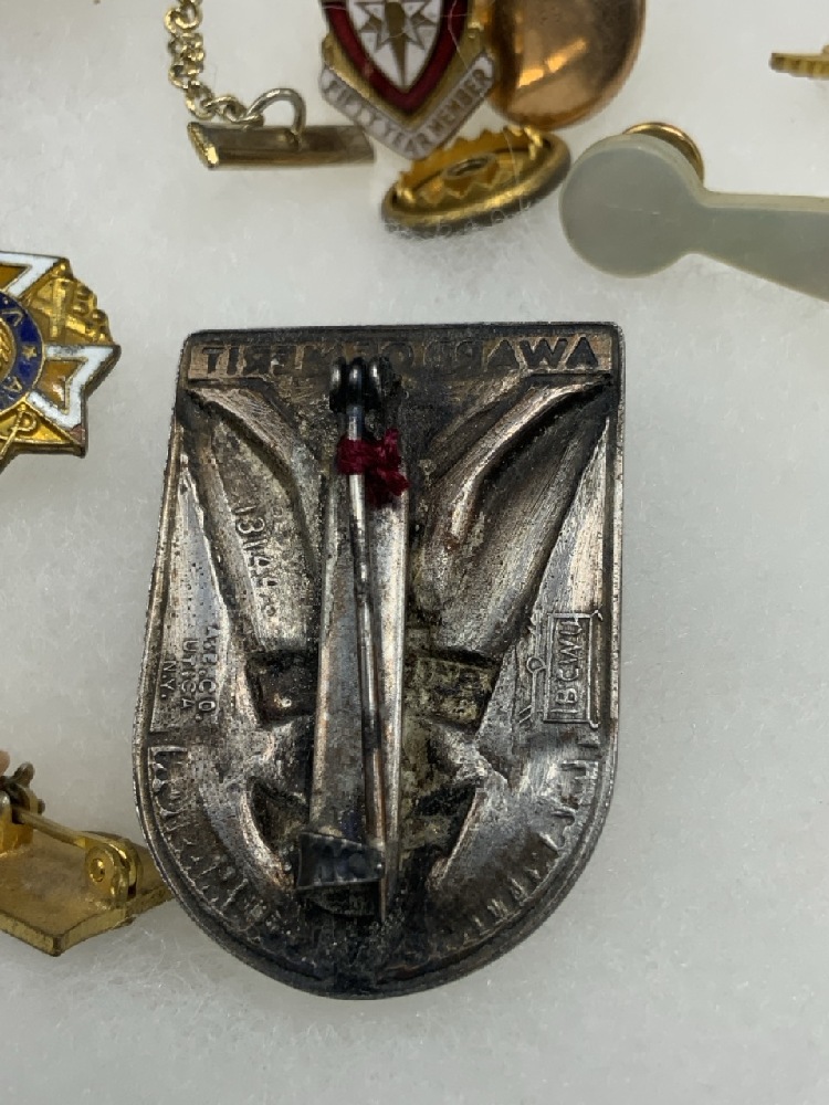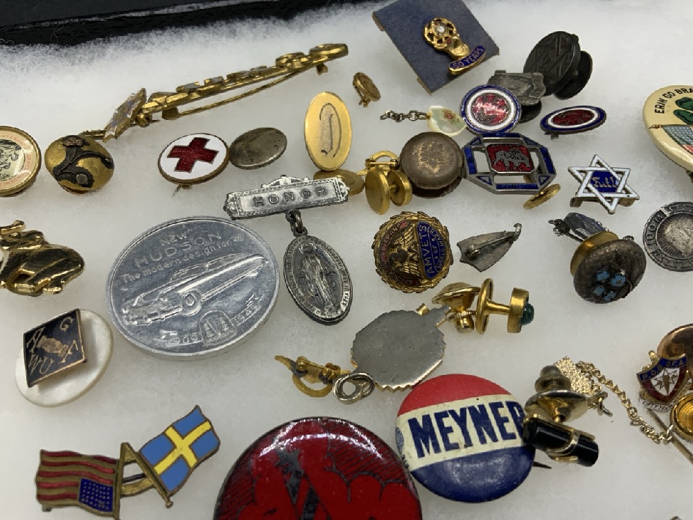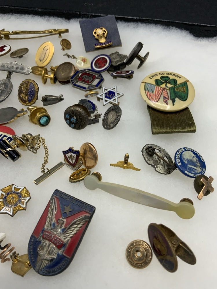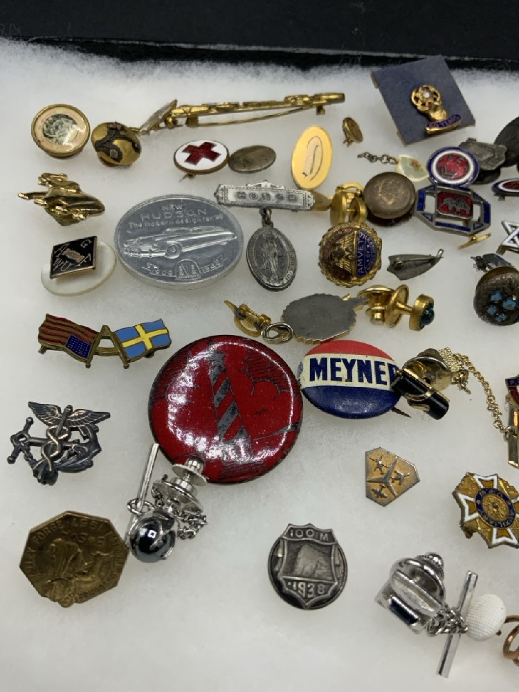 Curious Lot Men’s Military Medals, Tie Backs, and Pins. Advertising and related. As seen in photograph preview.