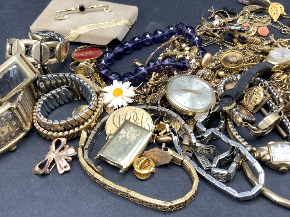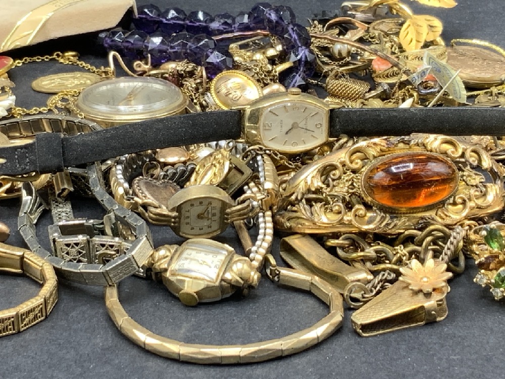 Estate Compiled Jewelry including Gold Filled, Gold Plate, Rolled Gold, Gold Tone And Gold Overlay. Large amount of early pieces etc. As seen in photograph preview.