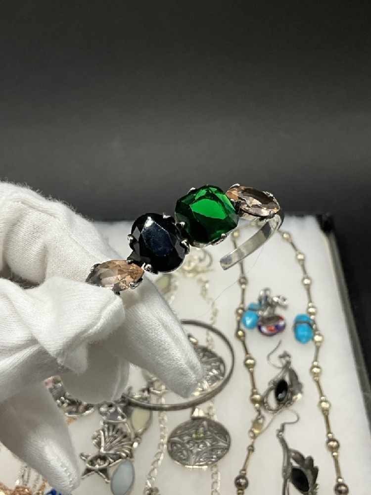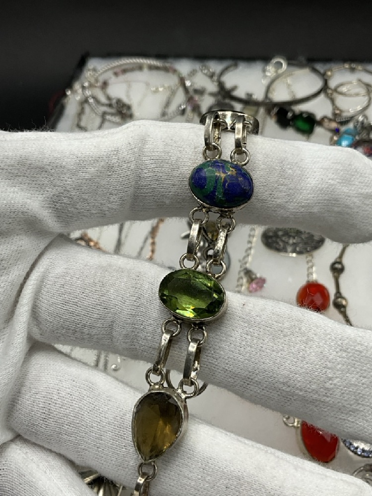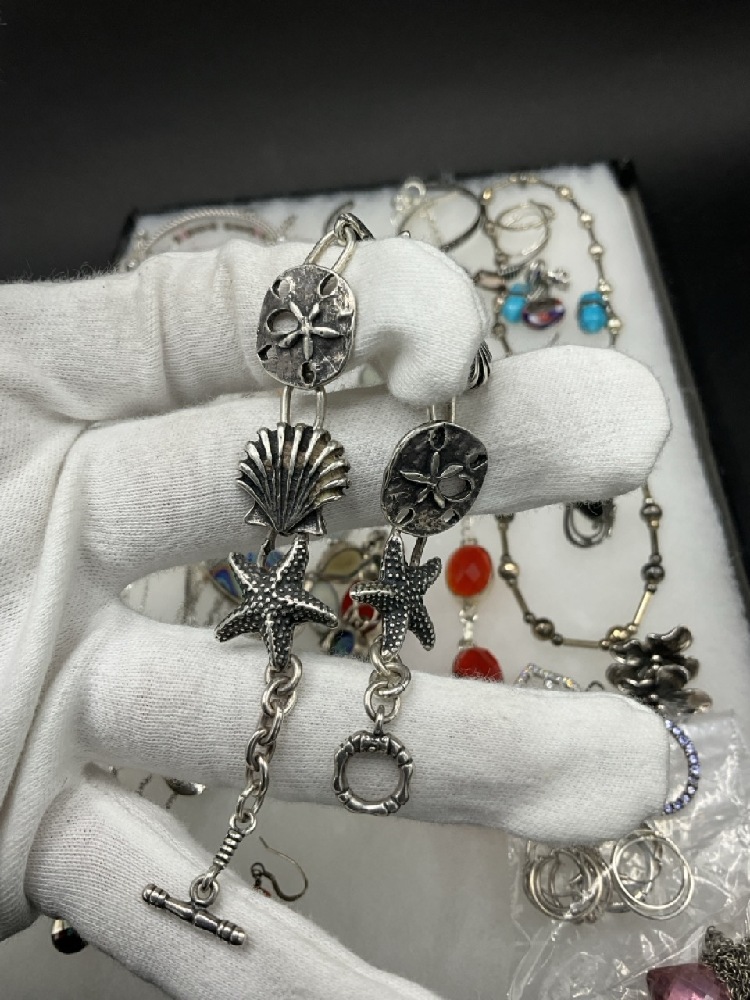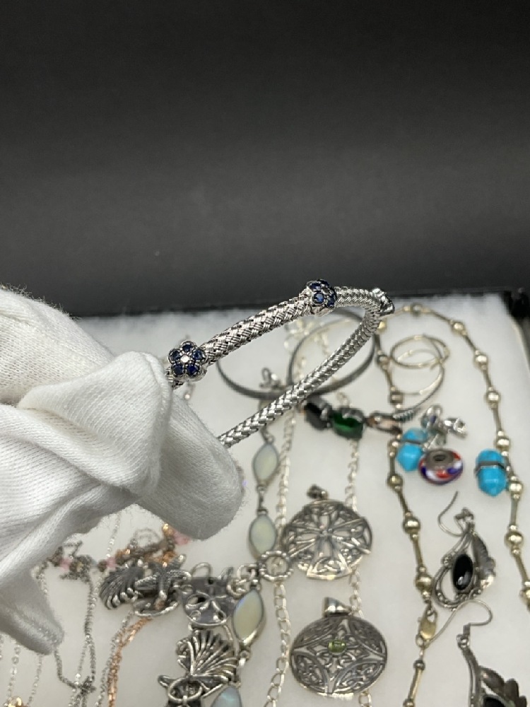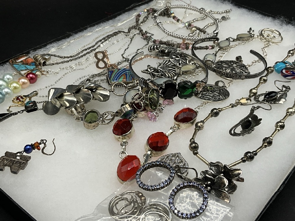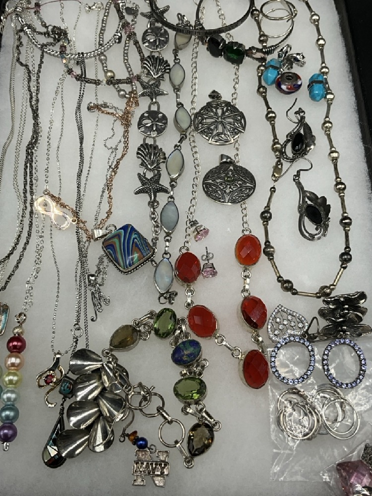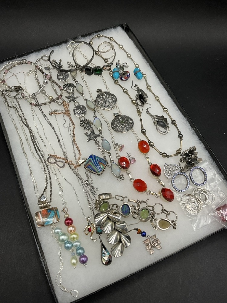 Compiled sterling silver jewelry group. Necklaces, bracelets and pin. As seen in photograph preview.