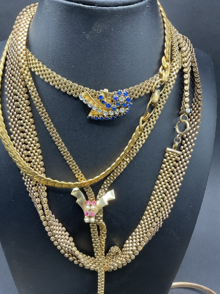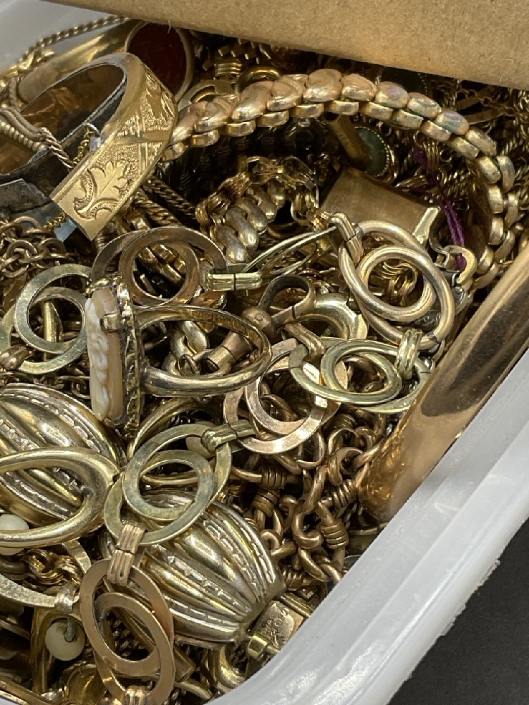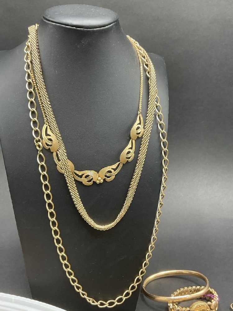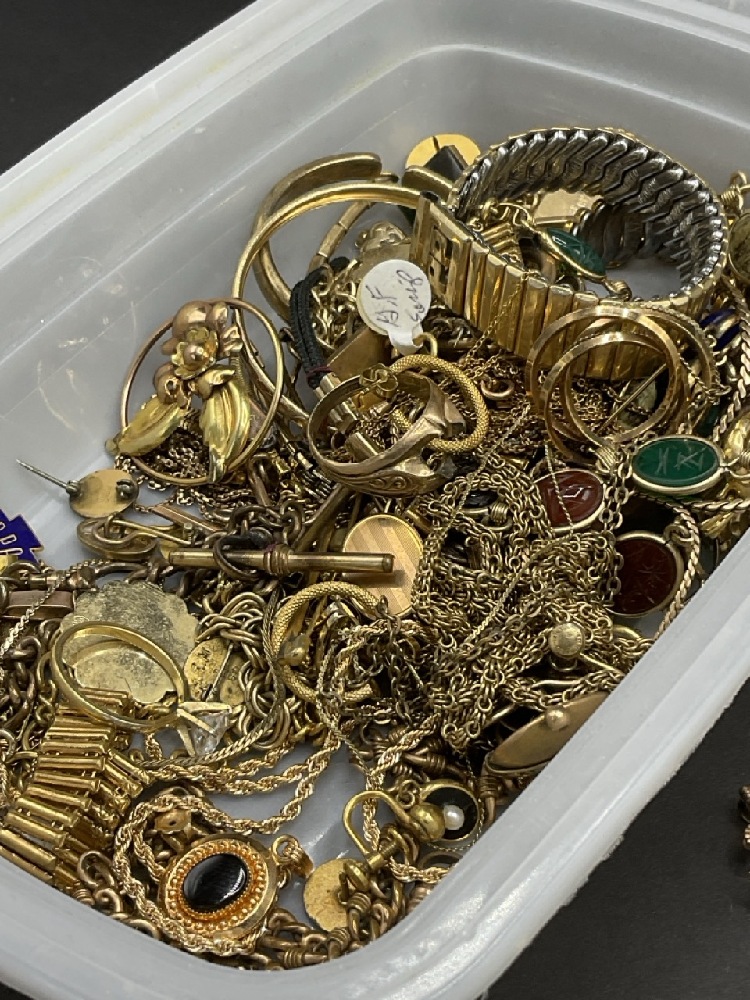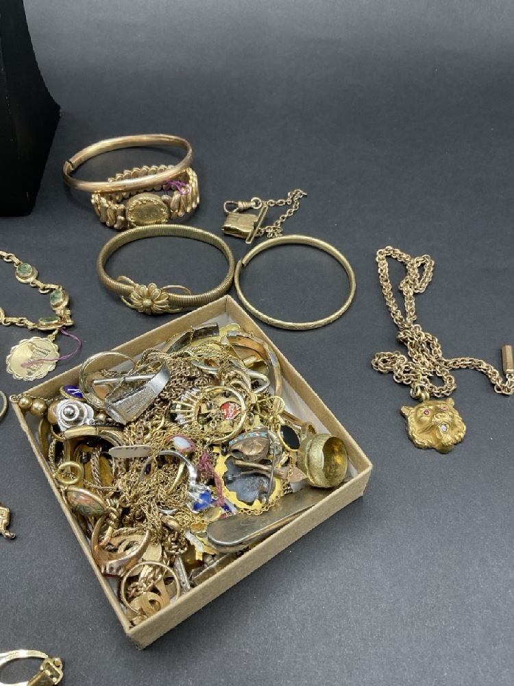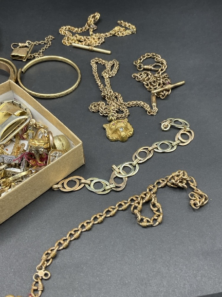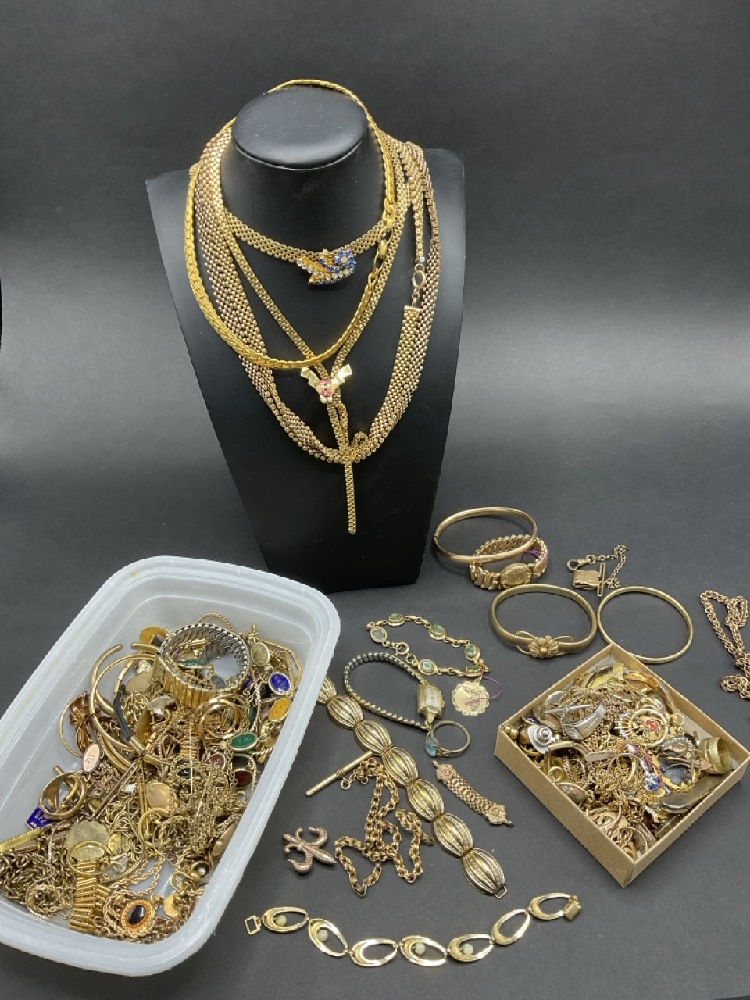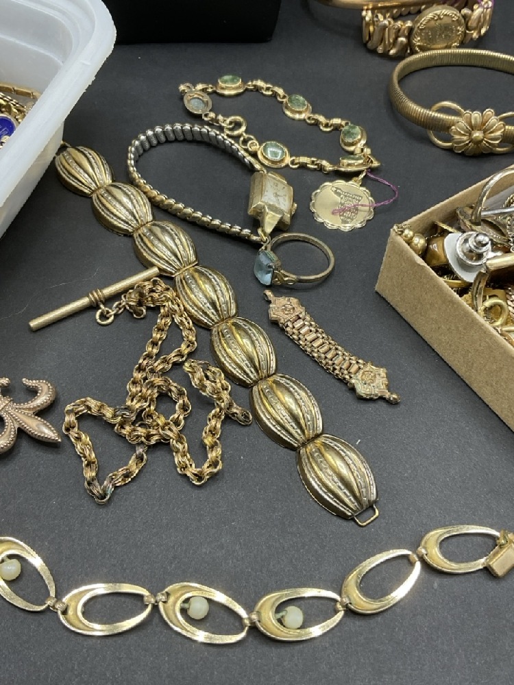 A Large grouping of mostly gold filled jewelry. Assorted unmarked and arked 1/20 10k,12k,14, rolled golled or gold filled. Antique watch chains, several necklaces, gemstone bracelets, rings etc.