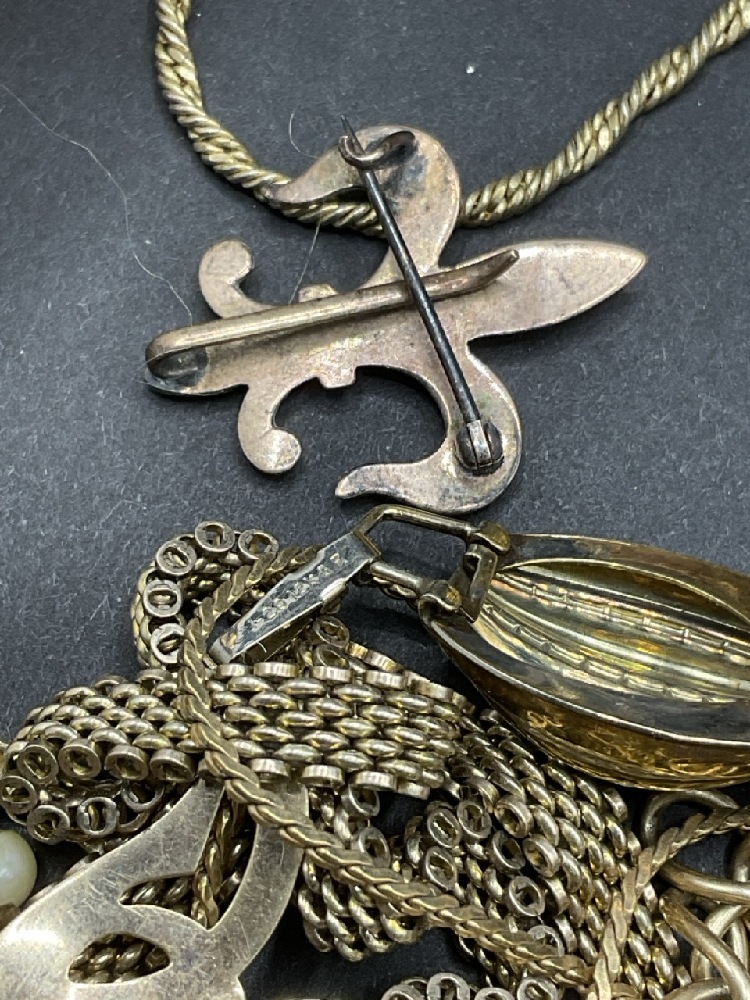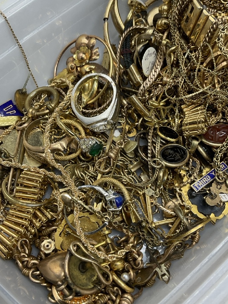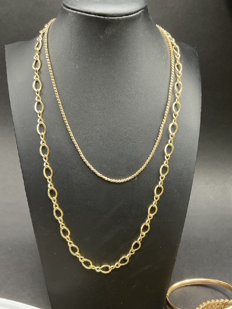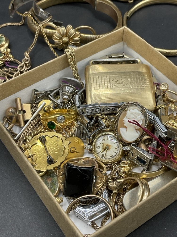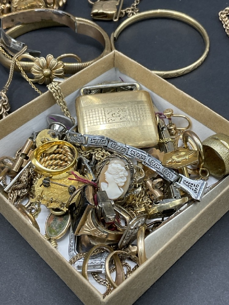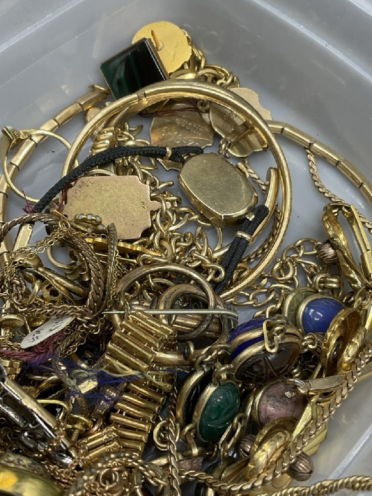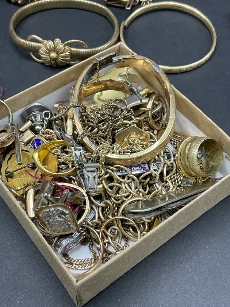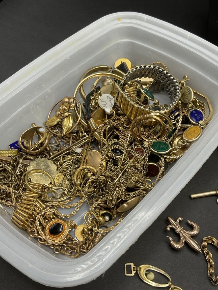 A Large grouping of mostly gold filled jewelry. Assorted unmarked and arked 1/20 10k,12k,14, rolled golled or gold filled. Antique watch chains, several necklaces, gemstone bracelets, rings etc.