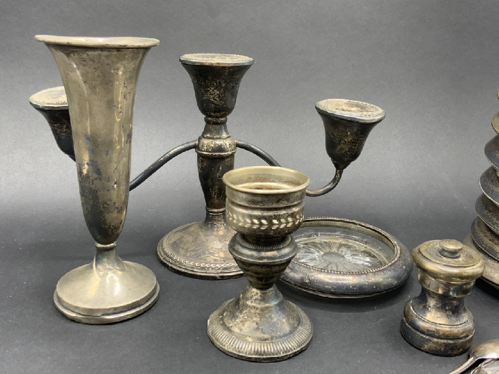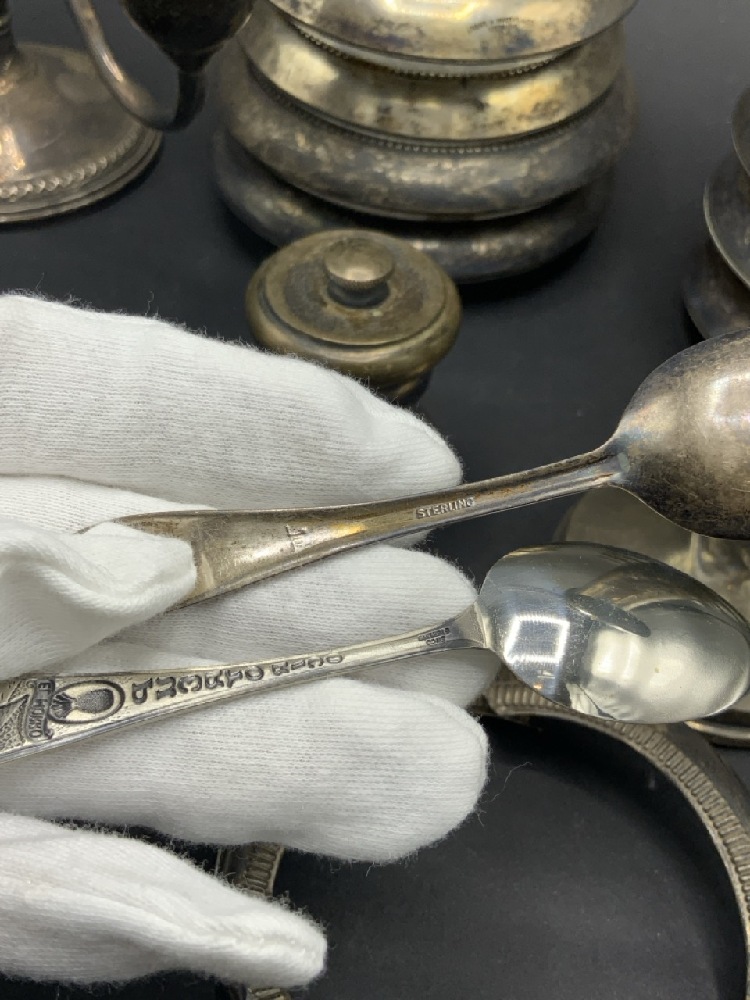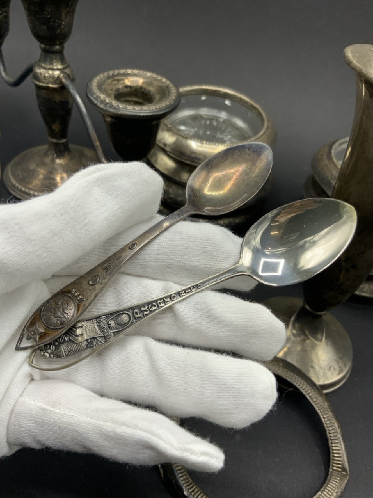 Estate compiled sterling silver table wares. Glass with sterling rimmed coasters, sterling silver weighted candelabra, candlestick and vase, two sterling silver spoons. As seen in photograph preview.