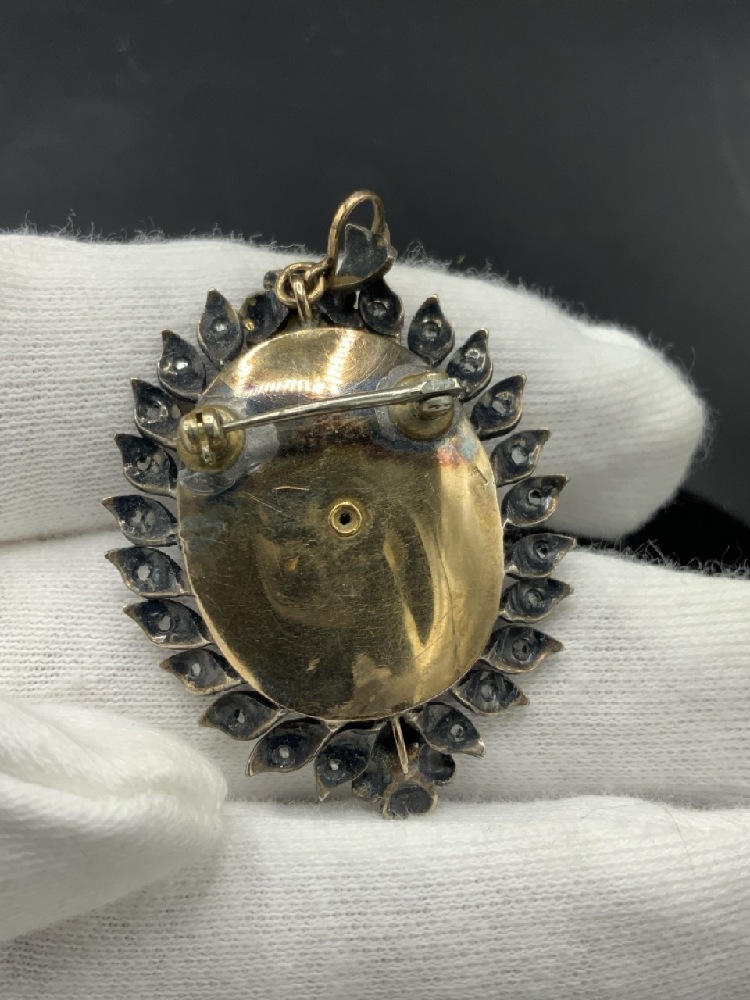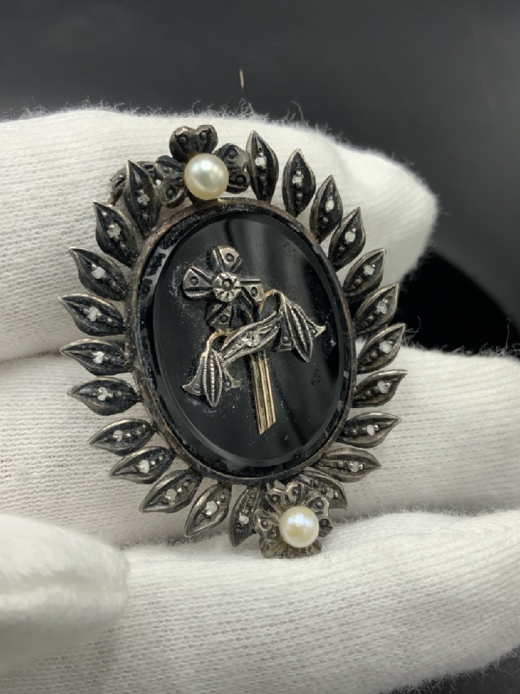 A Victorian mourning brooch/pin. Probably 19th century with pearl and crosse mounted on onyx stone bordered with marcasite stones. Backing appears to be gold with sterling silver.