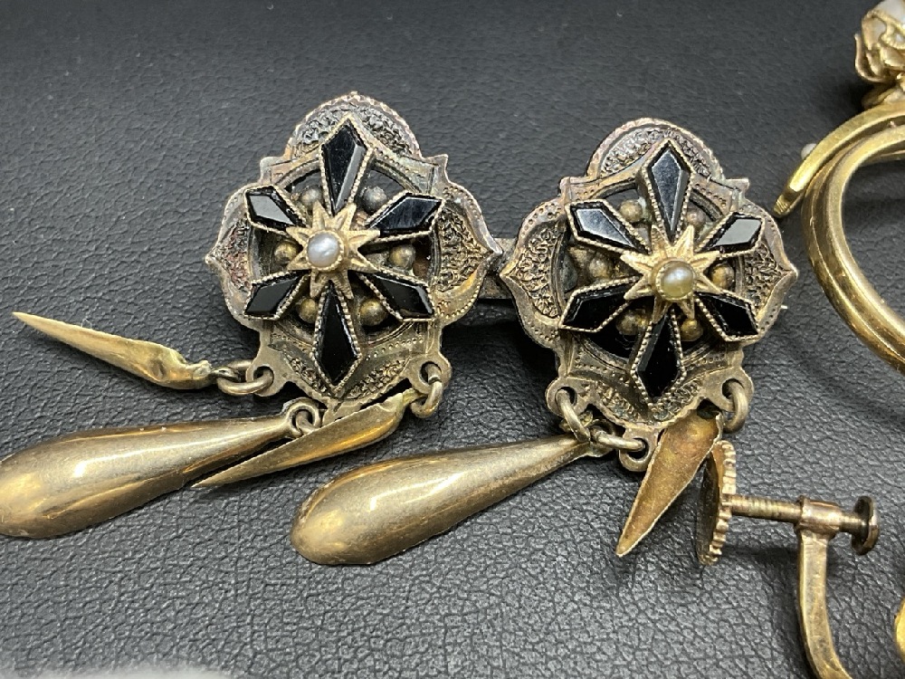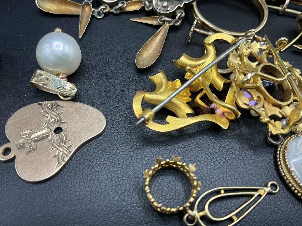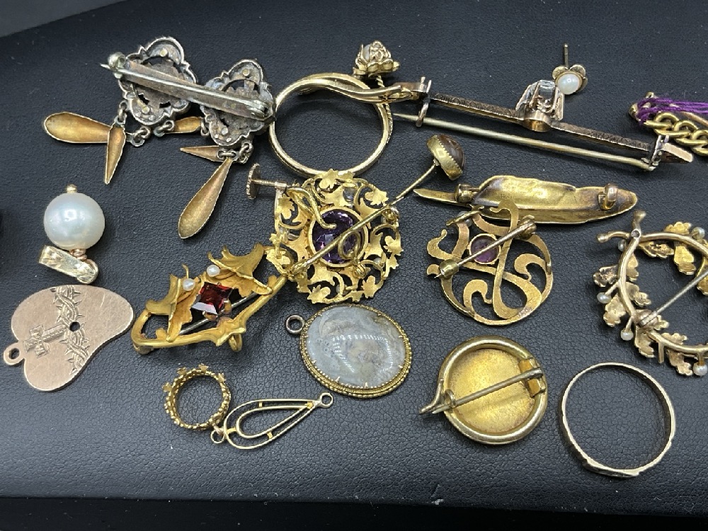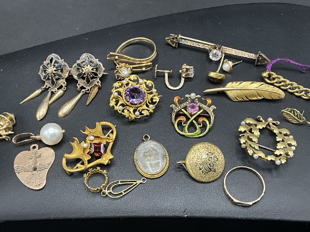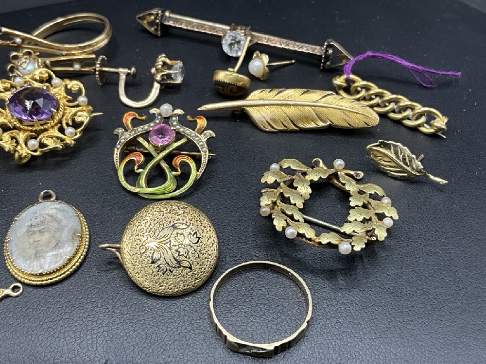 A compiled grouping of Antique and vintage jewelry. Goldtone and low karat gold pieces. Amethyst pin, enameled pin, Mostly Victorian period.