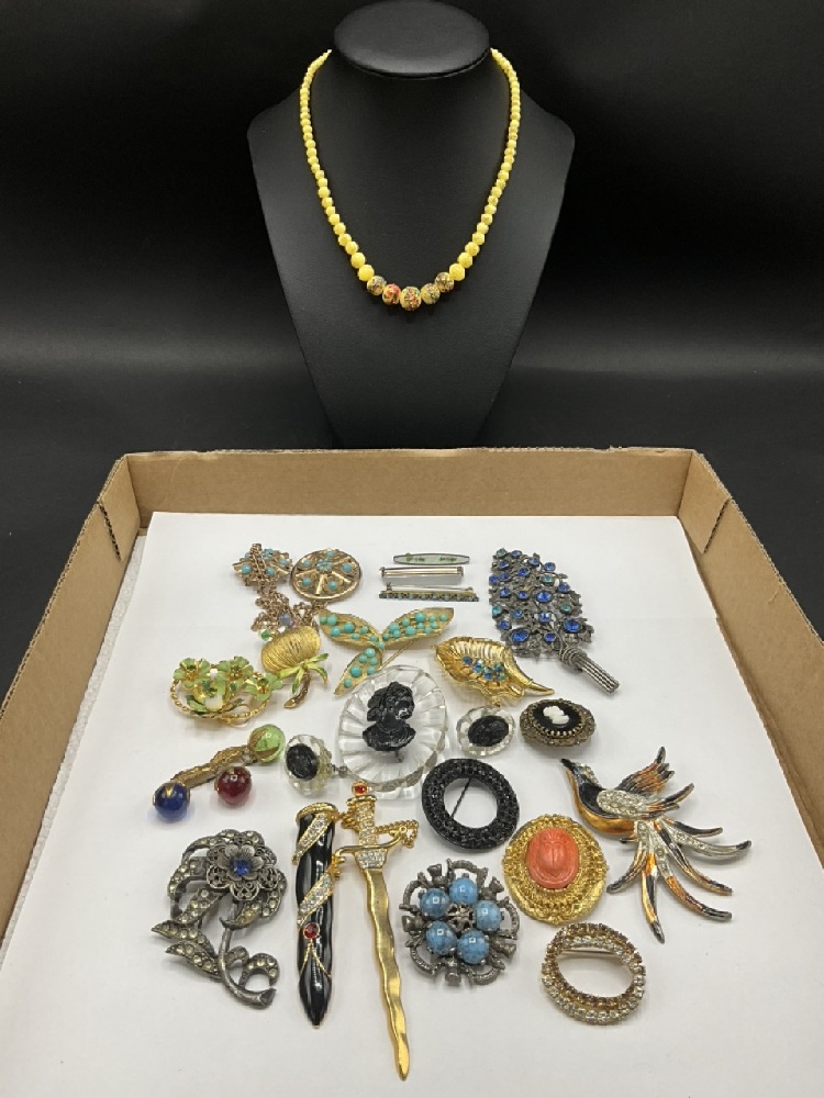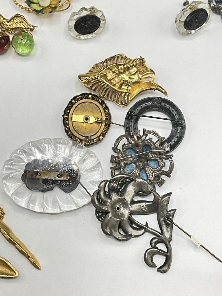Compiled Vintage Costume Jewelry Group Including Lisner, Weiss, Miracle etc. Rhinestone pins, Lucite cameos etc. As seen in photograph preview.