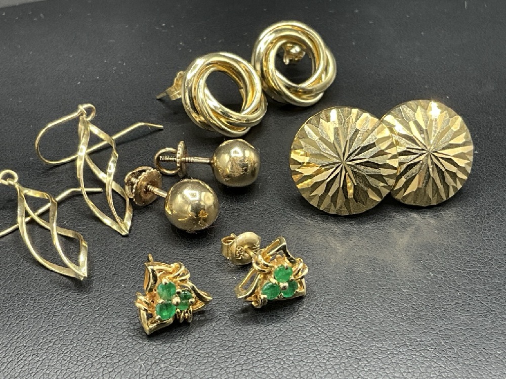 Five (5) Pairs of 14K Yellow Gold Earrings. A pair of emerald earrings, gold ball studs, dangle, hoops and disc earrings. As seen in photograph preview.