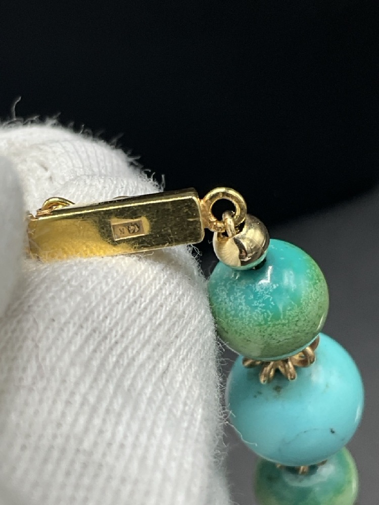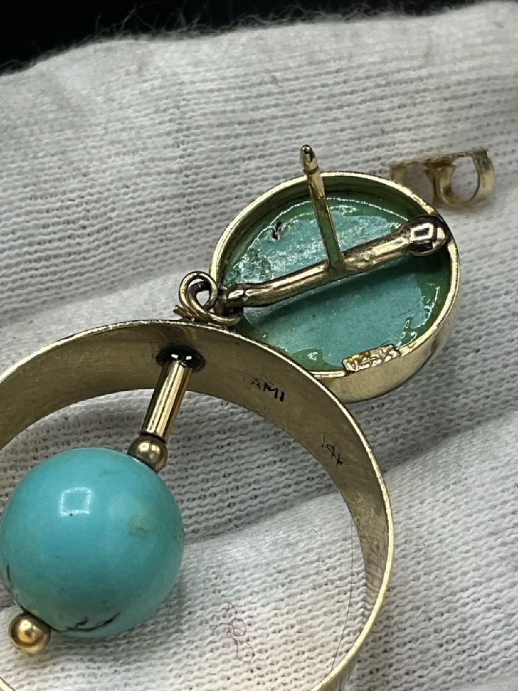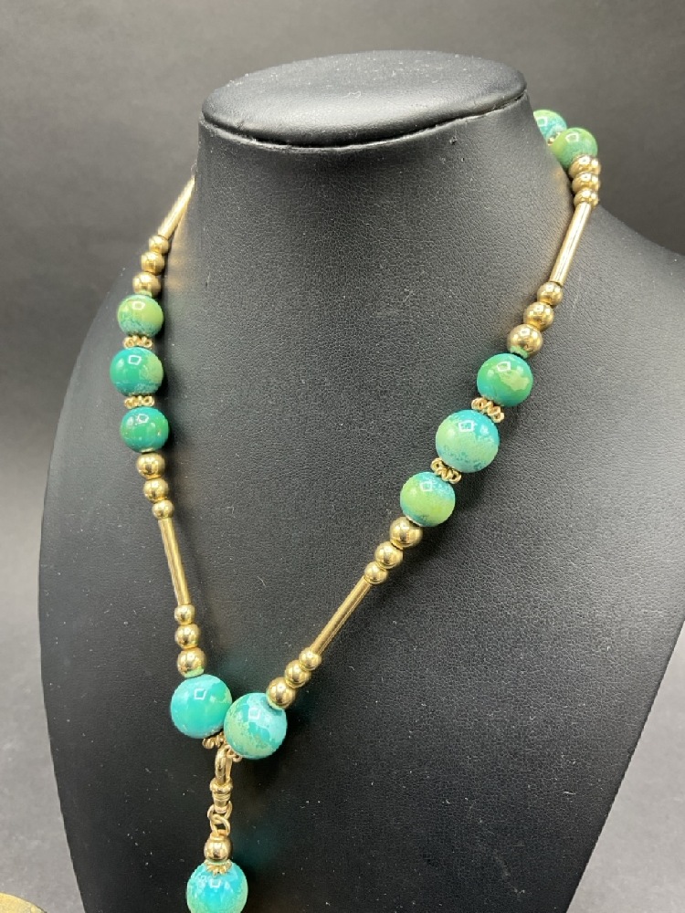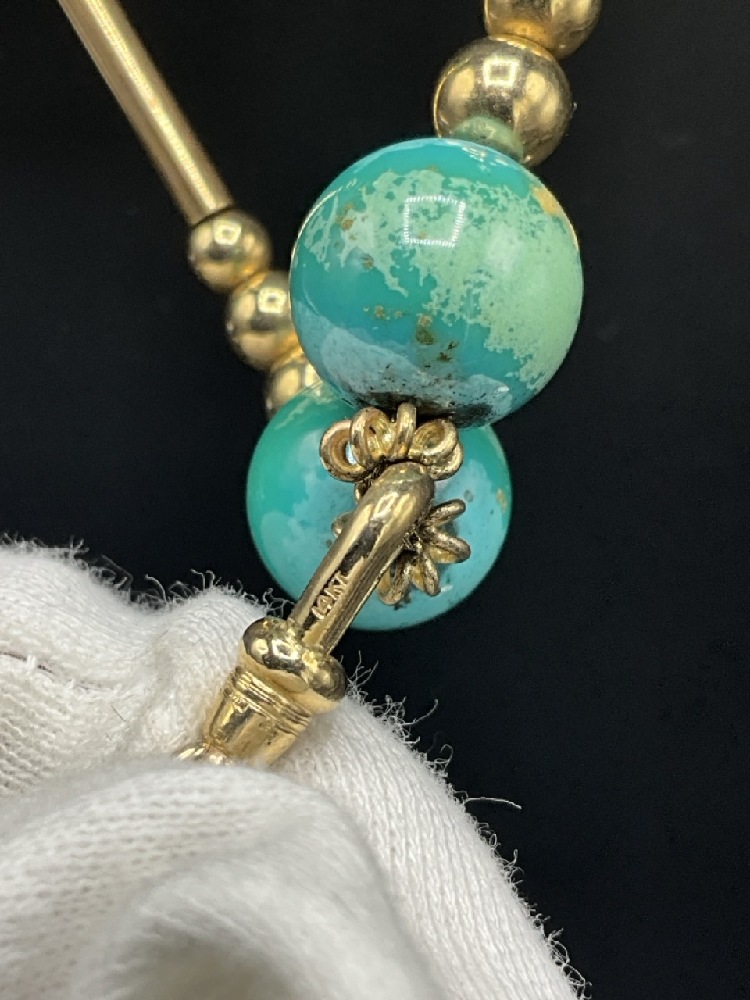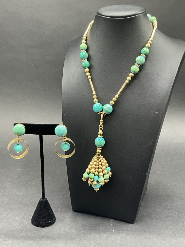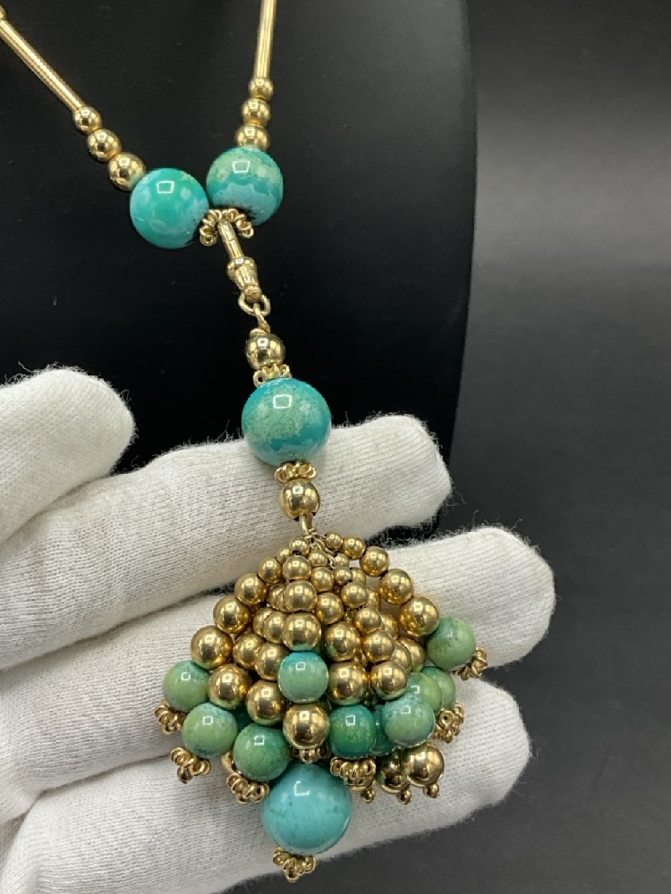 Vintage Turquoise and 14K Yellow Gold Tassel Necklace with Earrings. Earrings signed "TAMI"