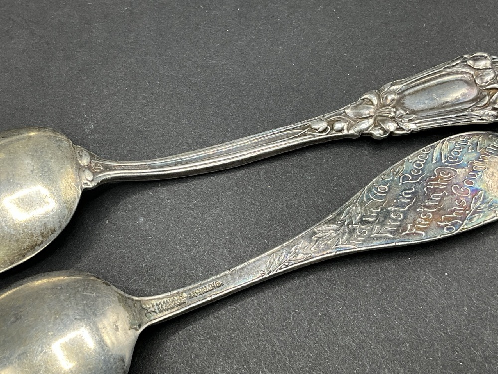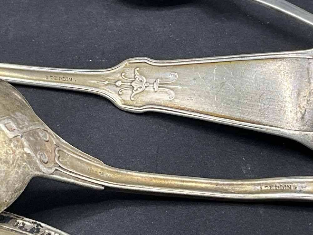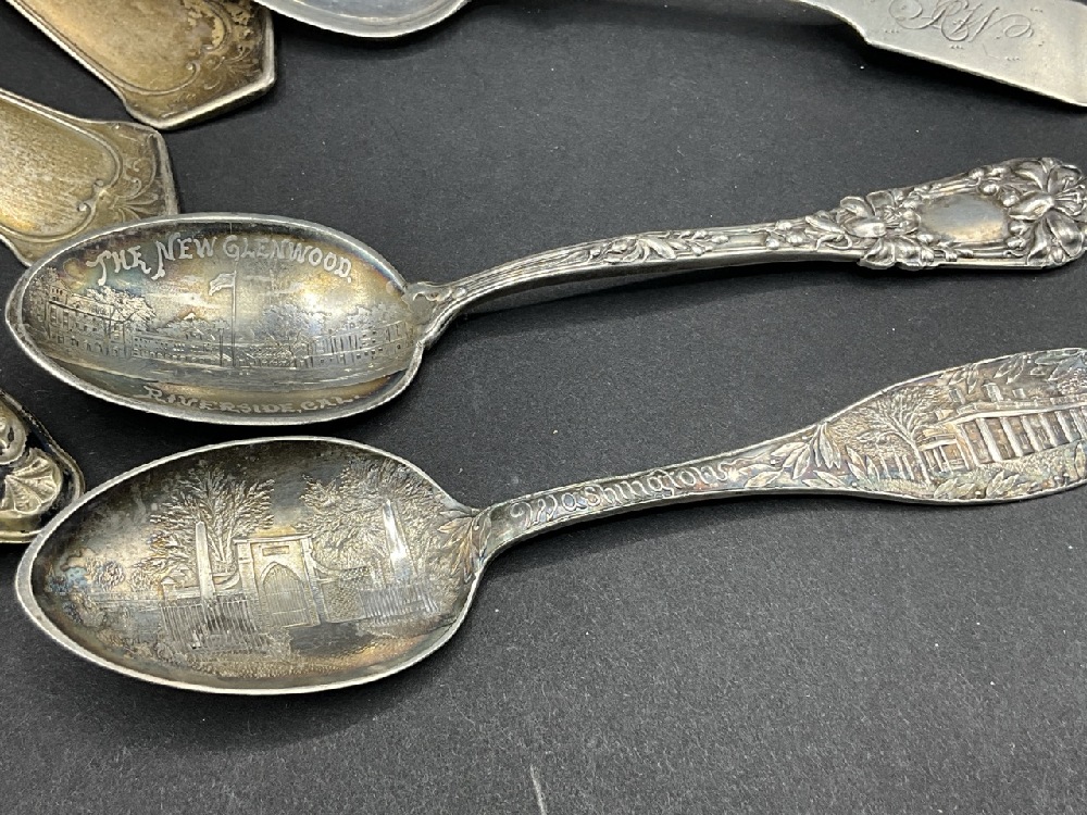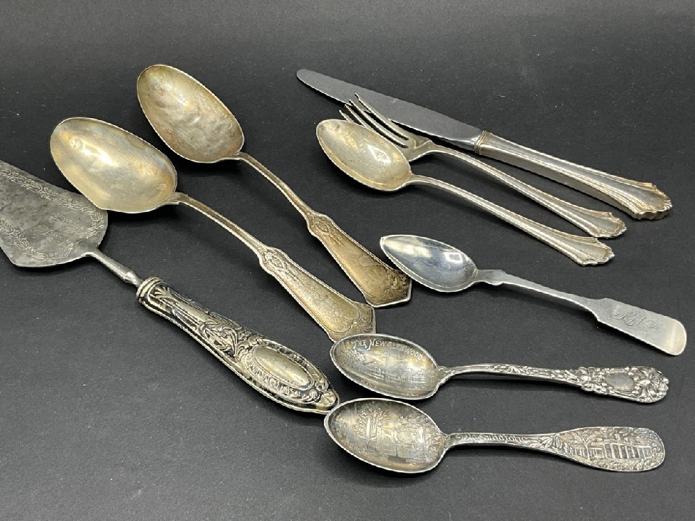 Sterling silver flatware grouping. Three (3) Coin silver spoons, Three (3) piece Lunt sterling spoon, fork and dinner knife, Two (2) sterling silver souvenir spoons and 800 silver handled server. As seen in photograph preview.