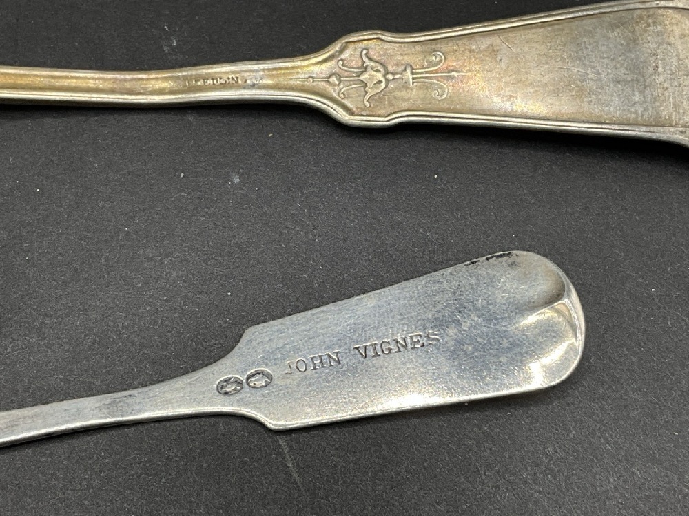 Coin silver weight: 102.6 grams and sterling weight is 151.6 grams. Overall 254.2 grams. (knife and 800 server not included in weights)