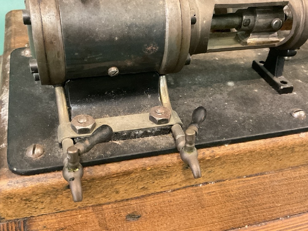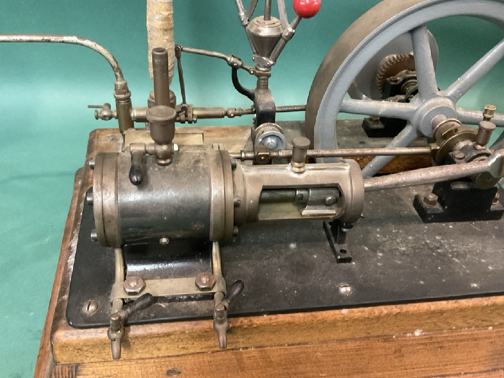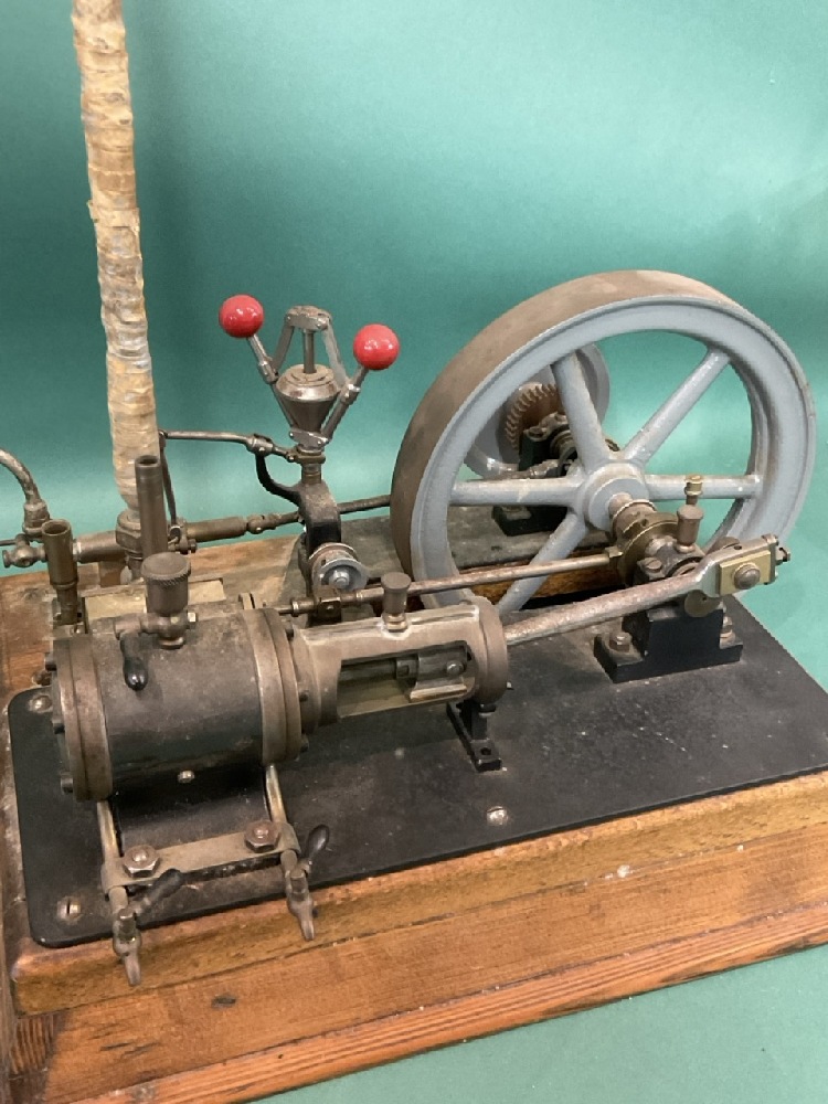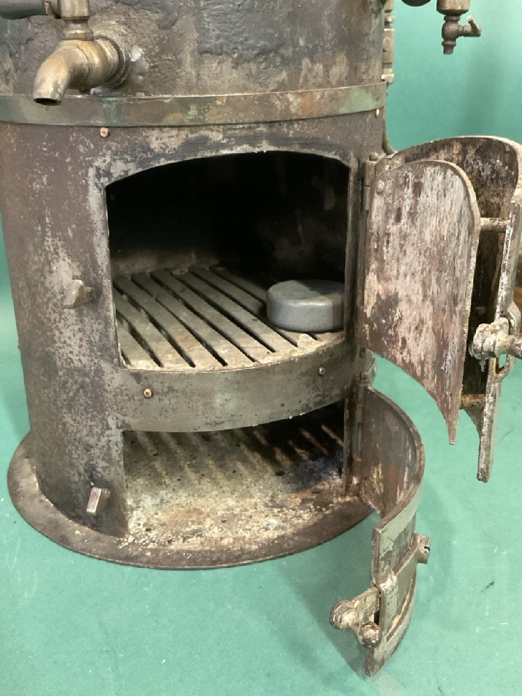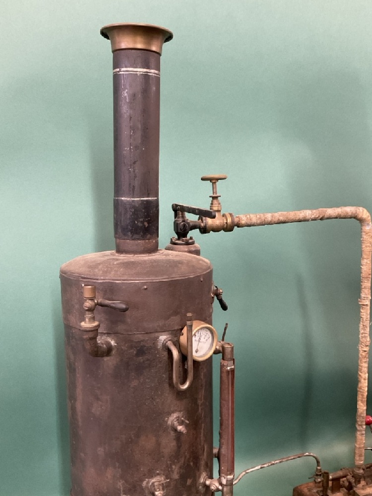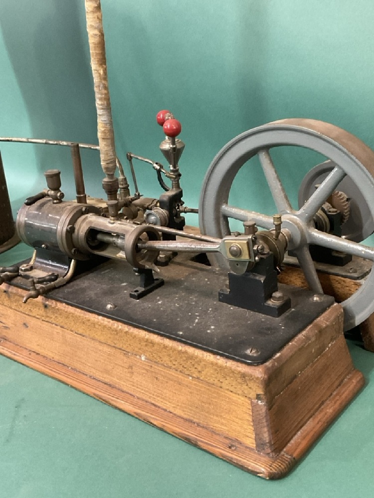 Dimensions: Engine Base 10” x 13 1/2” , 7” Flywheel, weighs 16lbs, Coal Fires Firetube Boiler 7 1/2” d. 19” height, 30” with stack engine originally had faux Brick Surround to Base