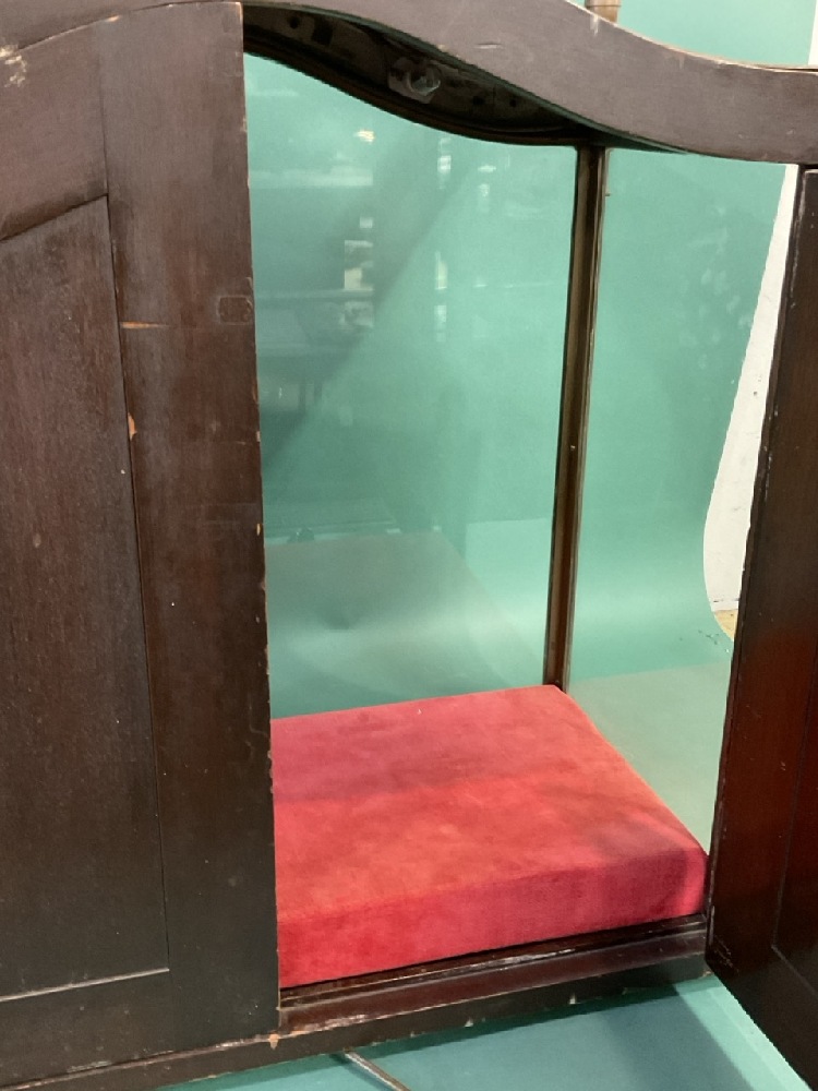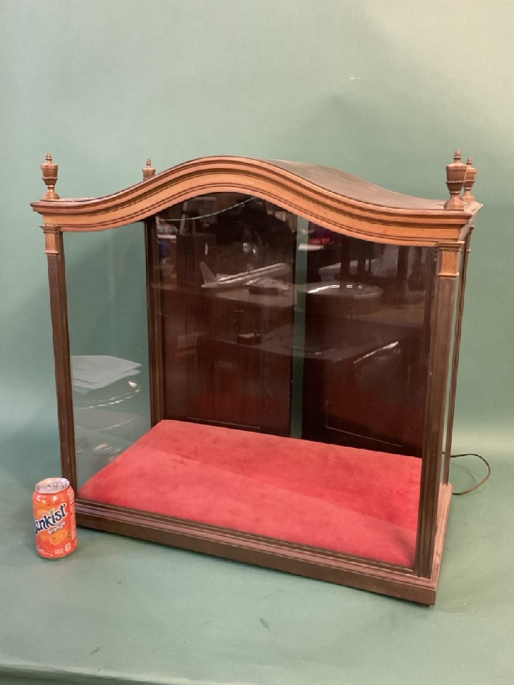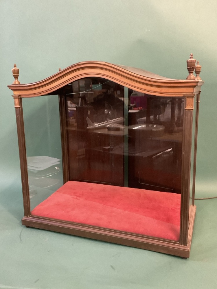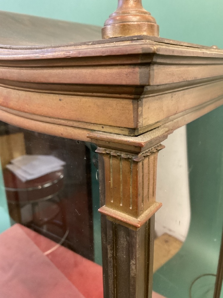 Vintage Store Display Bronze Showcase. Very good overall patina. curved top with four finials, back having two blind double wood doors.