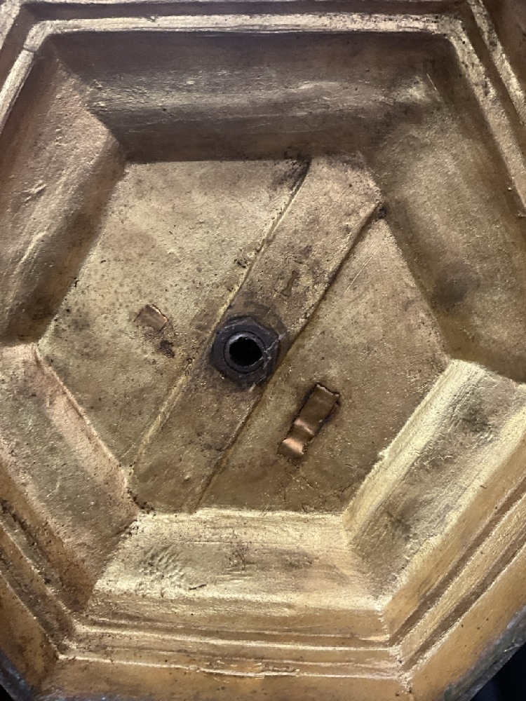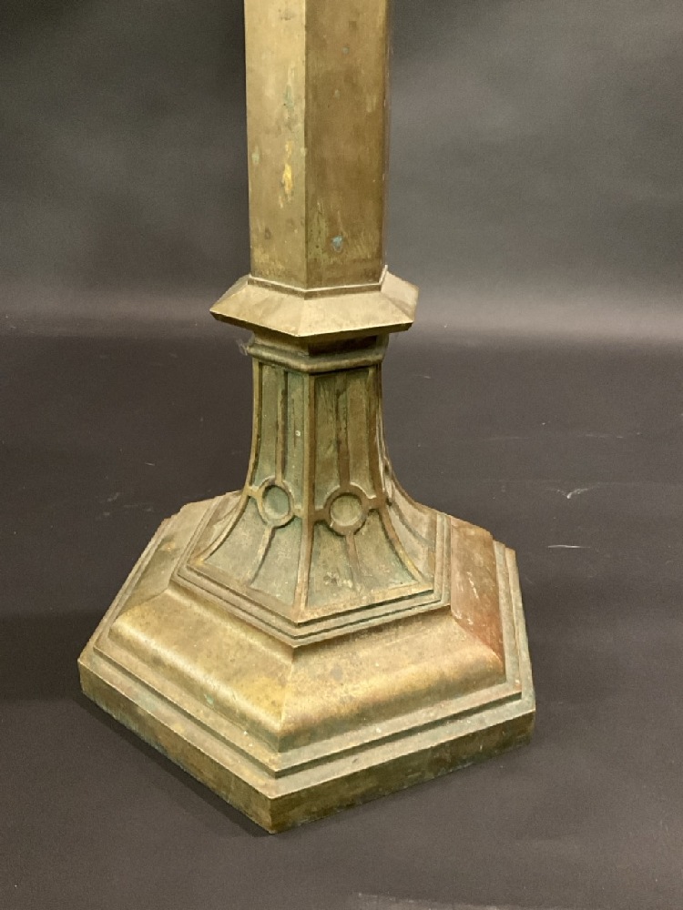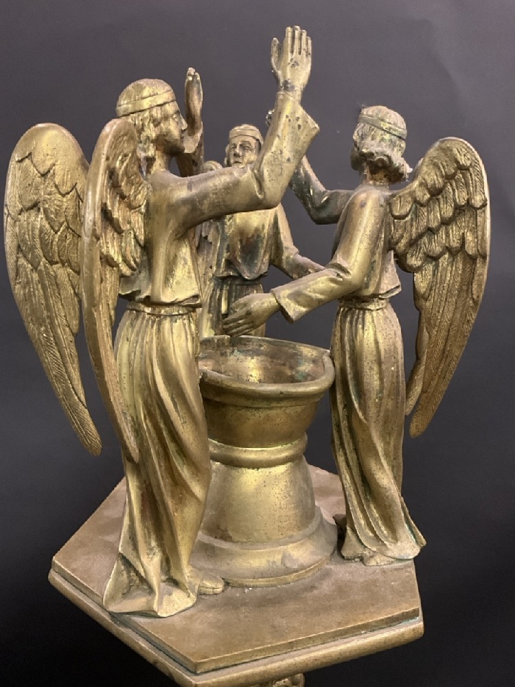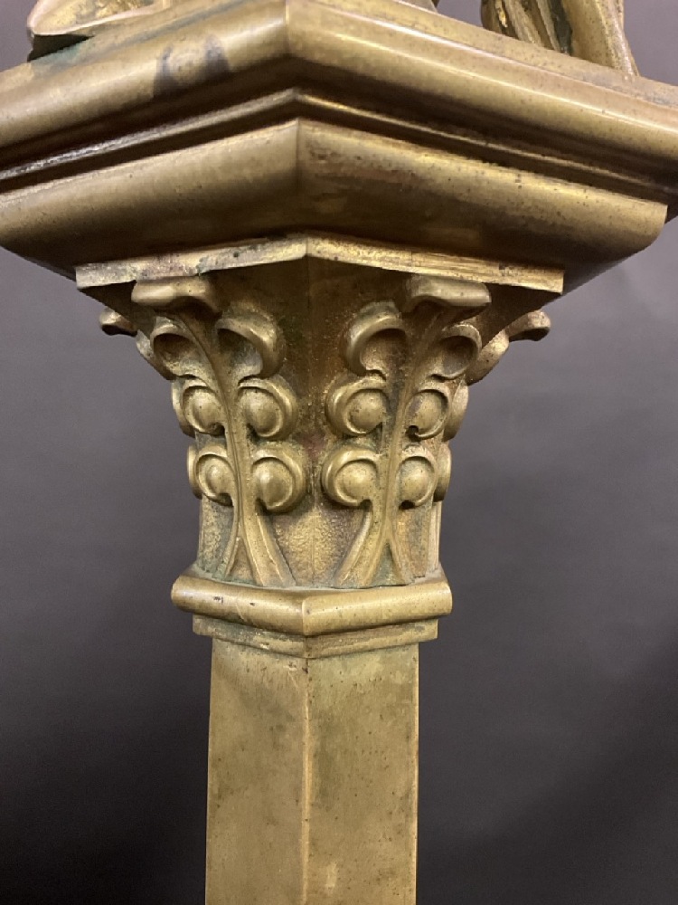 Antique Religious Standing Pillar Candle Holder with Three Angels Rejoicing. Brass metal with excellent patina. Late 19th or early 20th century. Originally would have been in a monastery or chapel.